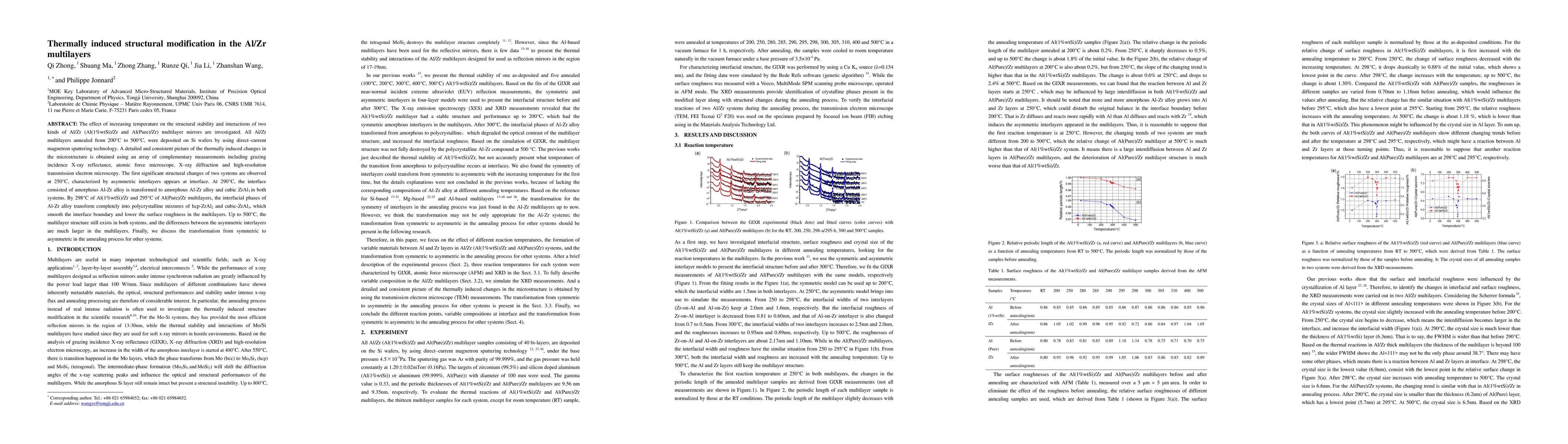 This study investigates the thermal effects on the structural stability of Al/Zr multilayers, revealing significant changes starting at 250°C, with the formation of amorphous Al-Zr alloy and cubic ZrAl3 phases by 290°C. The interfaces transition to polycrystalline mixtures of hcp-ZrAl2 and cubic-ZrAl3, smoothing the interface and reducing surface roughness.