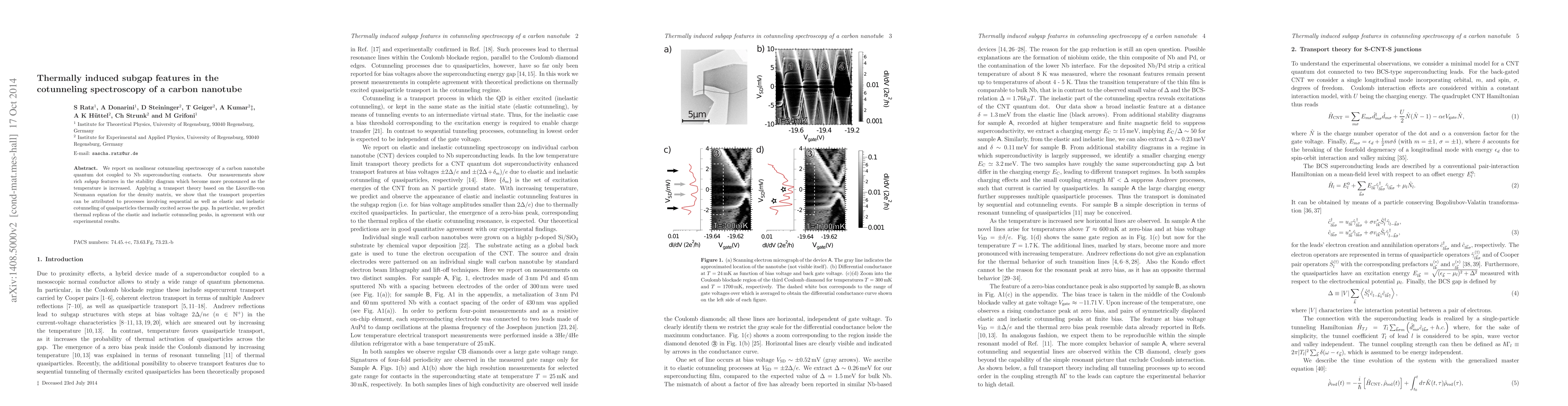 This paper investigates nonlinear cotunneling spectroscopy in a carbon nanotube quantum dot connected to superconducting contacts, revealing enhanced subgap features at higher temperatures. Theoretical analysis attributes these phenomena to sequential and various types of cotunneling processes involving thermally excited quasiparticles.