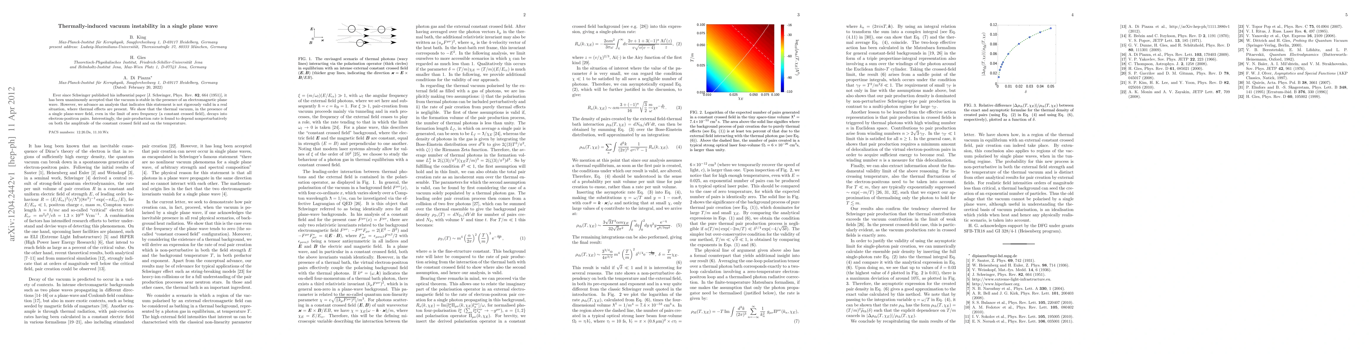 Ever since Schwinger published his influential paper [J. Schwinger, Phys. Rev. \textbf{82}, 664 (1951)], it has been unanimously accepted that the vacuum is stable in the presence of an electromagnetic plane wave. However, we advance an analysis that indicates this statement is not rigorously valid in a real situation, where thermal effects are present. We show that the thermal vacuum, in the presence of a single plane-wave field, even in the limit of zero frequency (a constant crossed field), decays into electron-positron pairs. Interestingly, the pair-production rate is found to depend nonperturbatively on both the amplitude of the constant crossed field and on the temperature.