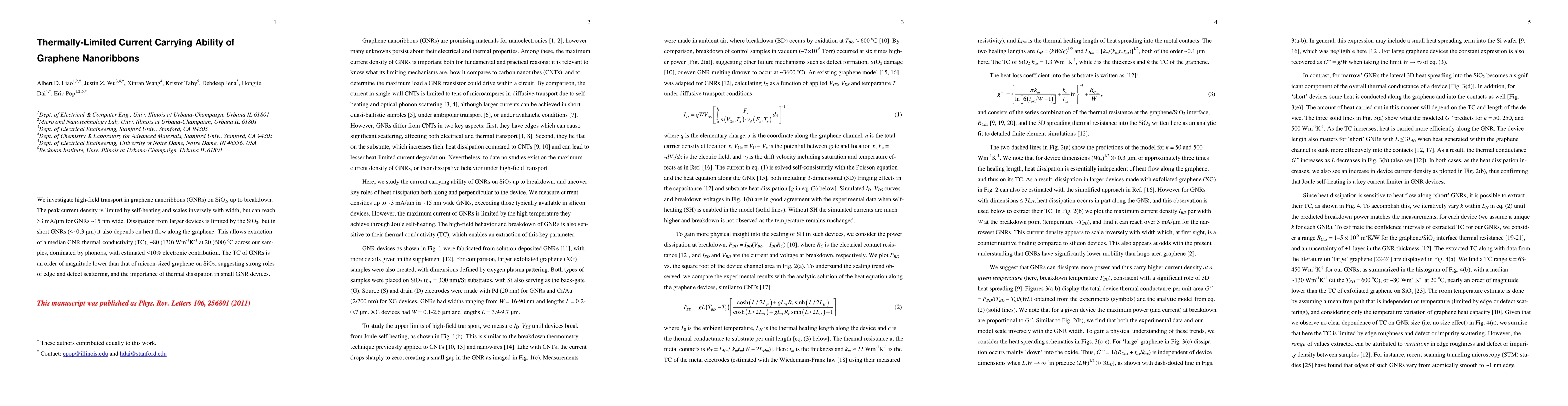 We investigate high-field transport in graphene nanoribbons (GNRs) on SiO2, up to breakdown. The maximum current density is limited by self-heating, but can reach >3 mA/um for GNRs ~15 nm wide. Comparison with larger, micron-sized graphene devices reveals that narrow GNRs benefit from 3D heat spreading into the SiO2, which enables their higher current density. GNRs also benefit from lateral heat flow to the contacts in short devices (< ~0.3 um), which allows extraction of a median GNR thermal conductivity (TC), ~80 W/m/K at 20 C across our samples, dominated by phonons. The TC of GNRs is an order of magnitude lower than that of micron-sized graphene on SiO2, suggesting strong roles of edge and defect scattering, and the importance of thermal dissipation in small GNR devices.