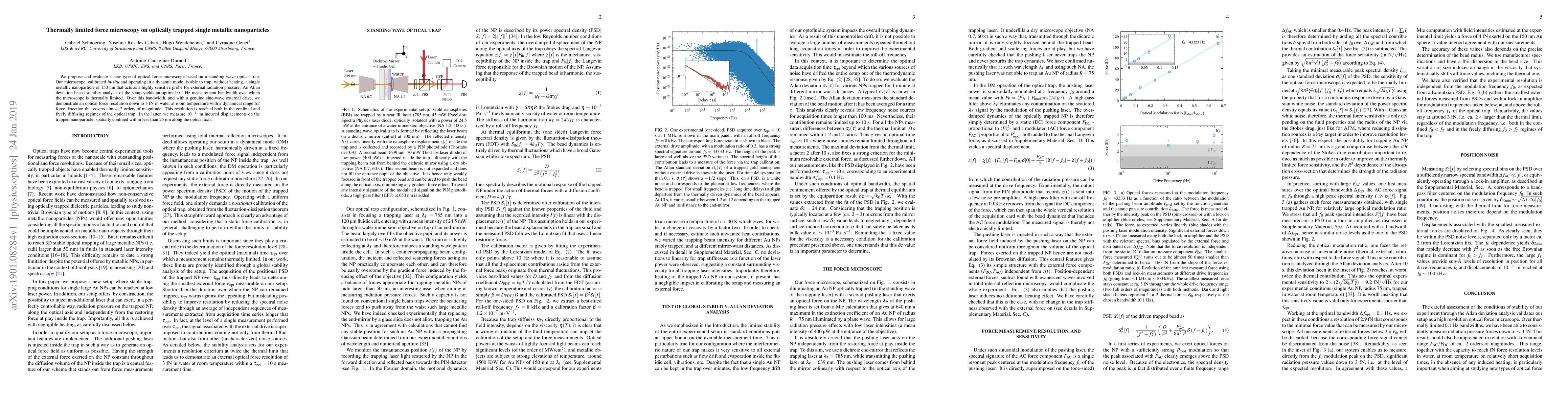 A new type of optical force microscope that can trap and measure single metallic nanoparticles without heating has been developed, achieving a resolution of 3 fN in water at room temperature.