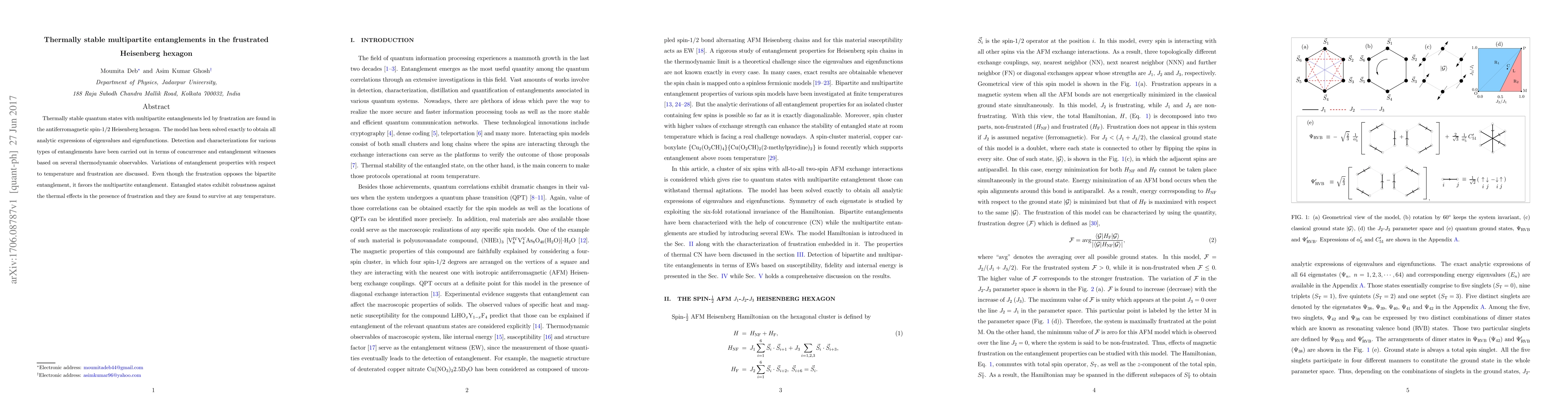 This paper identifies thermally stable multipartite entanglements in the antiferromagnetic spin-1/2 Heisenberg hexagon model, demonstrating that despite frustration opposing bipartite entanglement, it promotes multipartite entanglement. The model's exact solution reveals robust entangled states that persist across all temperatures.