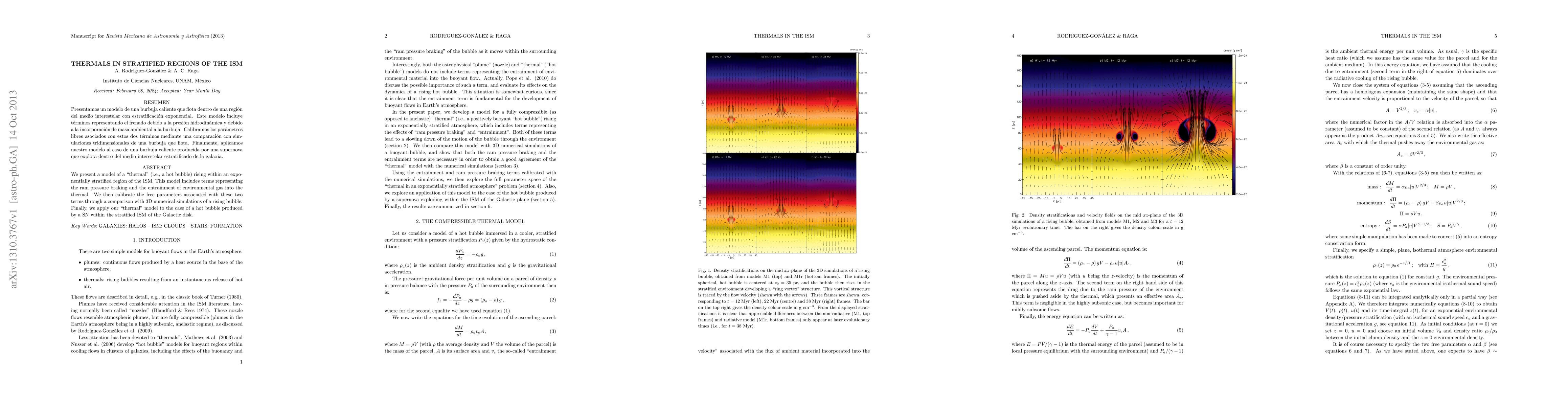 We present a model of a "thermal" (i.e., a hot bubble) rising within an exponentially stratified region of the ISM. This model includes terms representing the ram pressure braking and the entrainment of environmental gas into the thermal. We then calibrate the free parameters associated with these two terms through a comparison with 3D numerical simulations of a rising bubble. Finally, we apply our "thermal" model to the case of a hot bubble produced by a SN within the stratified ISM of the Galactic disk.