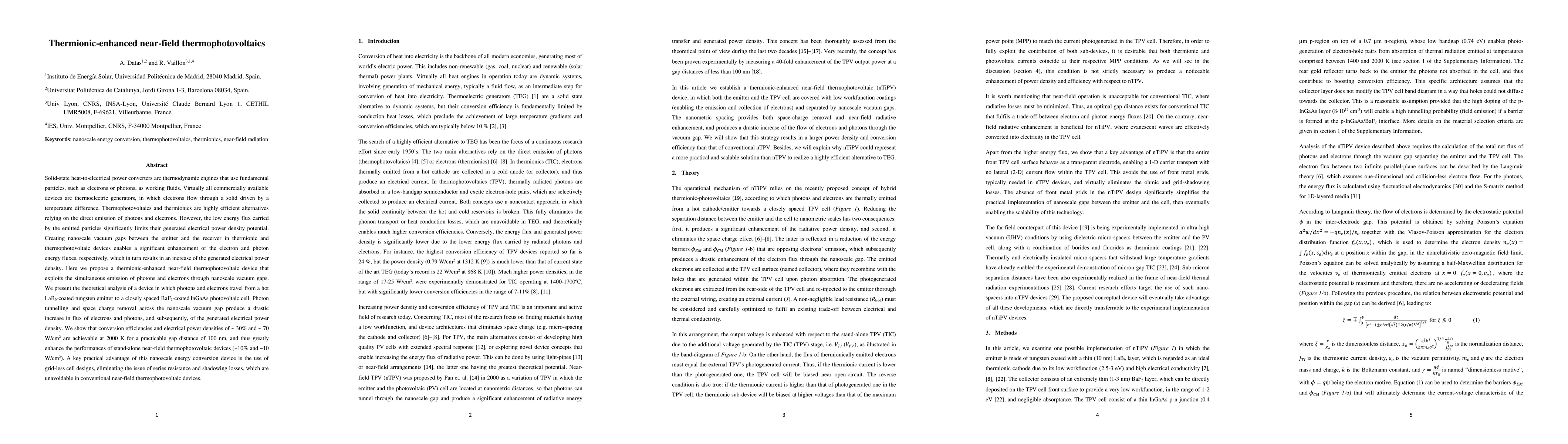 The paper presents a theoretical analysis of a novel thermionic-enhanced near-field thermophotovoltaic device, demonstrating improved conversion efficiencies and power densities through simultaneous photon and electron emission across nanoscale vacuum gaps.
