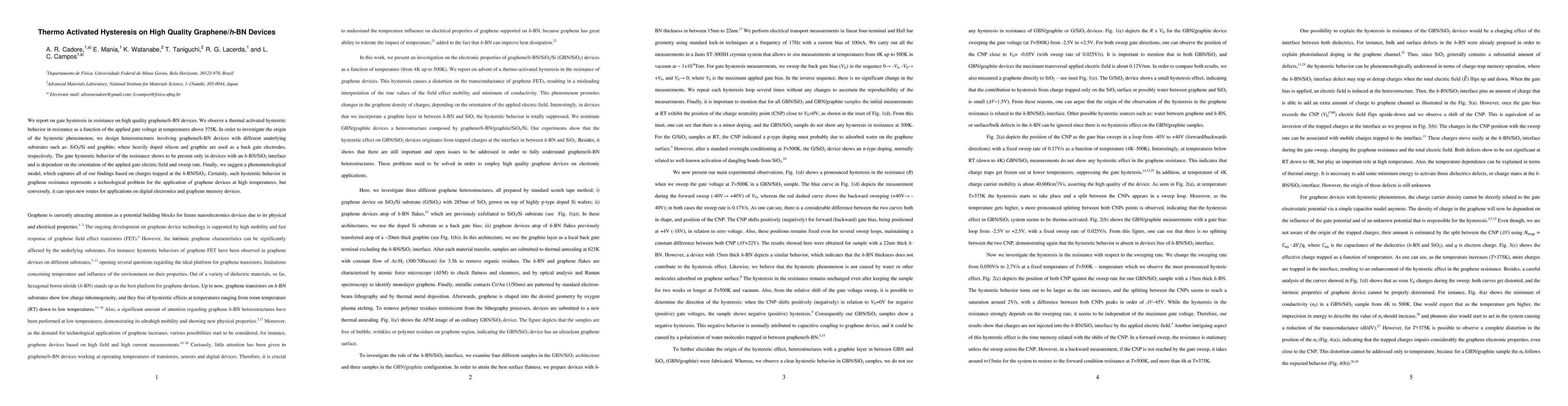 This research investigates thermal-activated hysteresis in resistance in high-quality graphene/h-BN devices, revealing its dependence on the h-BN/SiO2 interface and electric field orientation. A phenomenological model suggests trapped charges at the interface as the cause, highlighting both challenges and potential applications for graphene technology at elevated temperatures.