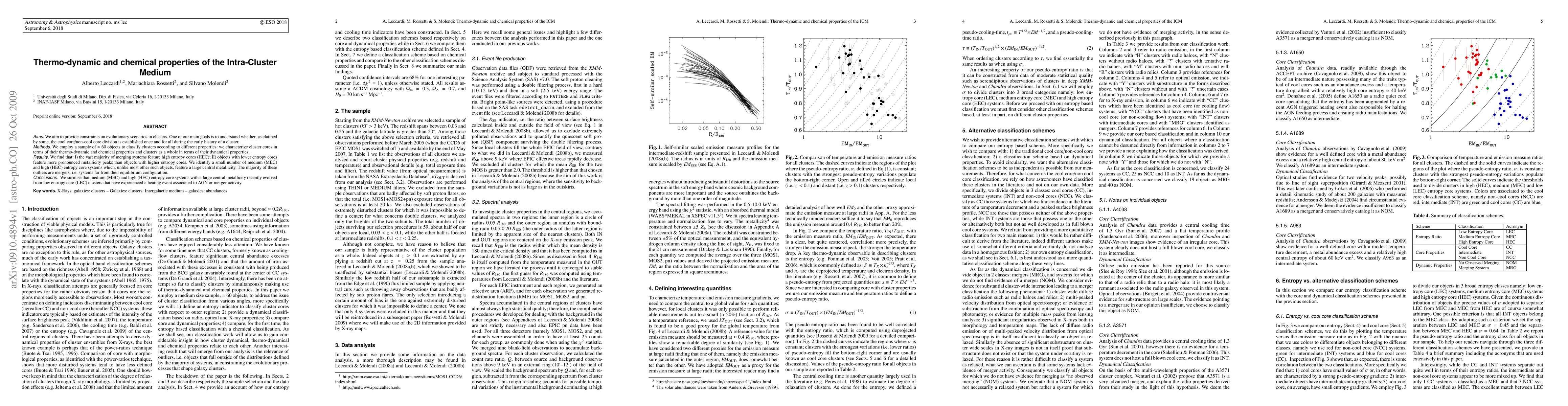 Aims. We aim to provide constraints on evolutionary scenarios in clusters. One of our main goals is to understand whether, as claimed by some, the cool core/non-cool core division is established once and for all during the early history of a cluster. Methods. We employ a sample of about 60 objects to classify clusters according to different properties: we characterize cluster cores in terms of their thermo-dynamic and chemical properties and clusters as a whole in terms of their dynamical properties. Results. We find that: I) the vast majority of merging systems feature high entropy cores (HEC); II) objects with lower entropy cores feature more pronounced metallicity peaks than objects with higher entropy cores. We identify a small number of medium (MEC) and high (HEC) entropy core systems which, unlike most other such objects, feature a large central metallicity. The majority of these outliers are mergers, i.e. systems far from their equilibrium configuration. Conclusions. We surmise that medium (MEC) and high (HEC) entropy core systems with a large central metallicity recently evolved from low entropy core (LEC) clusters that have experienced a heating event associated to AGN or merger activity.