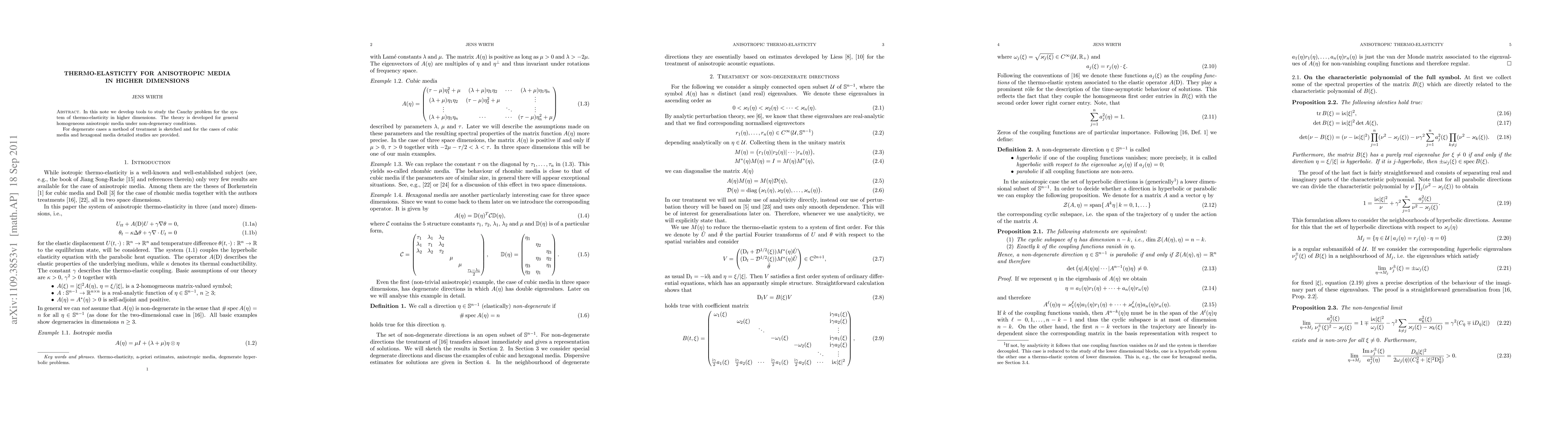 In this note we develop tools to study the Cauchy problem for the system of thermo-elasticity in higher dimensions. The theory is developed for general homogeneous anisotropic media under non-degeneracy conditions. For degenerate cases a method of treatment is sketched and for the cases of cubic media and hexagonal media detailed studies are provided.