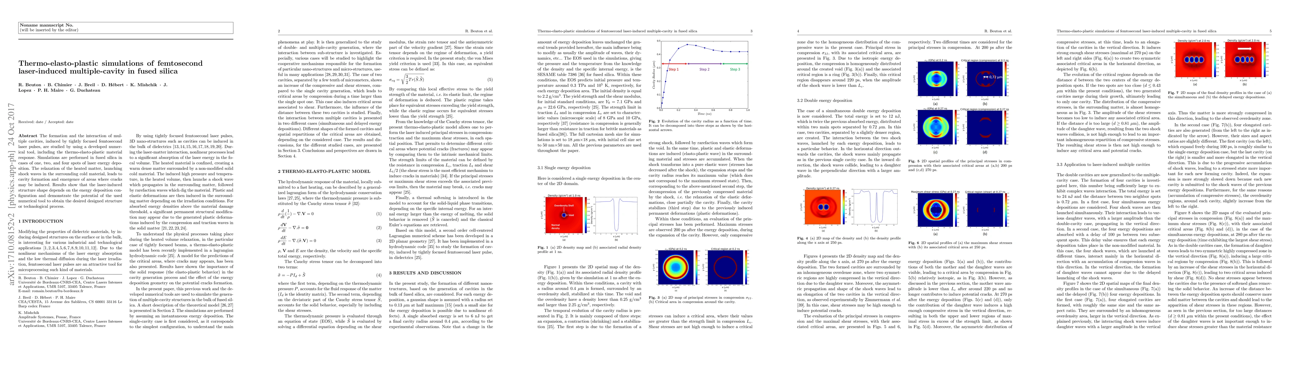 This paper investigates the formation and interaction of multiple cavities in fused silica induced by femtosecond laser pulses, using a thermo-elasto-plastic simulation tool. The study reveals that cavity shapes and crack formation depend on the laser energy deposition configuration, showcasing the tool's potential for precise structure design.
