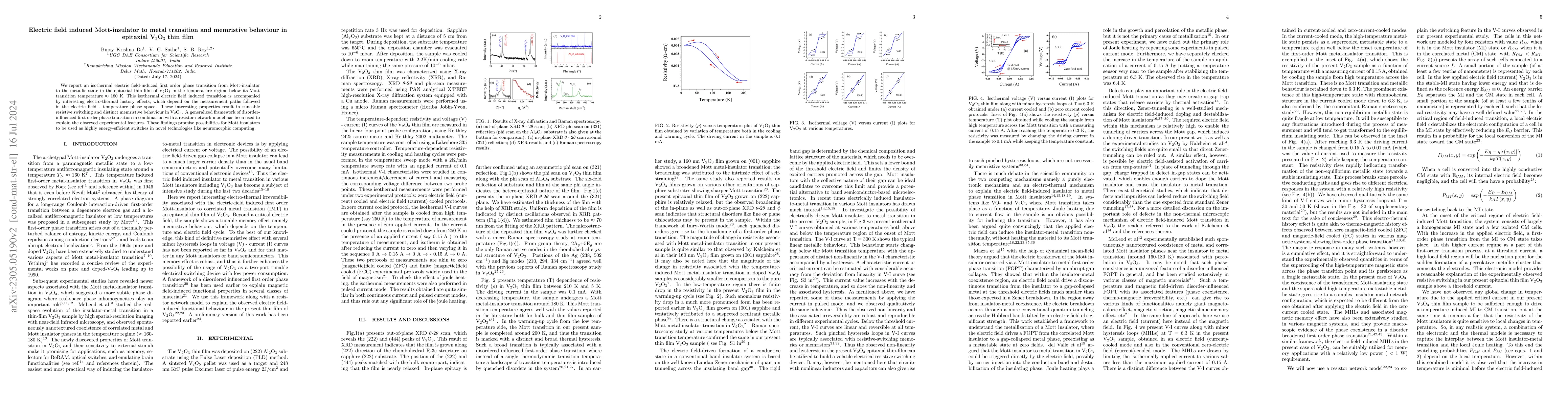 This study investigates thermo-electric history effects in V2O3 thin films, revealing electric field-induced phase transitions from Mott insulator to metallic state, leading to tunable resistive switching. These findings hold potential for energy-efficient optoelectronics and neuromorphic computing applications.