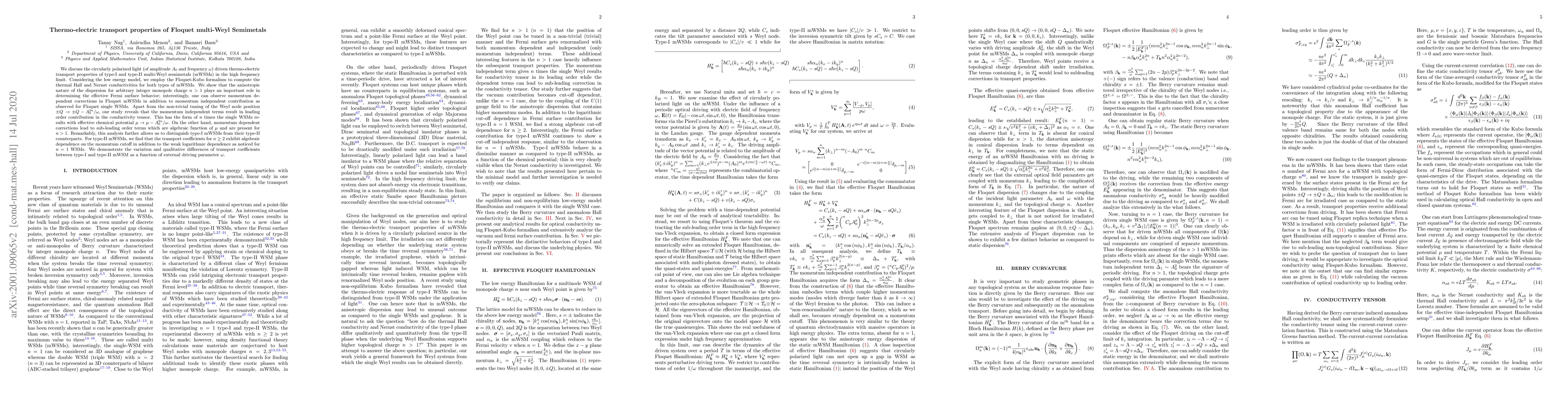 This paper explores the thermo-electric transport properties of Floquet multi-Weyl semimetals under circularly polarized light, using the Floquet-Kubo formalism. It reveals distinct momentum-dependent and independent contributions to the thermal Hall and Nernst conductivities, highlighting differences between type-I and type-II multi-Weyl semimetals.