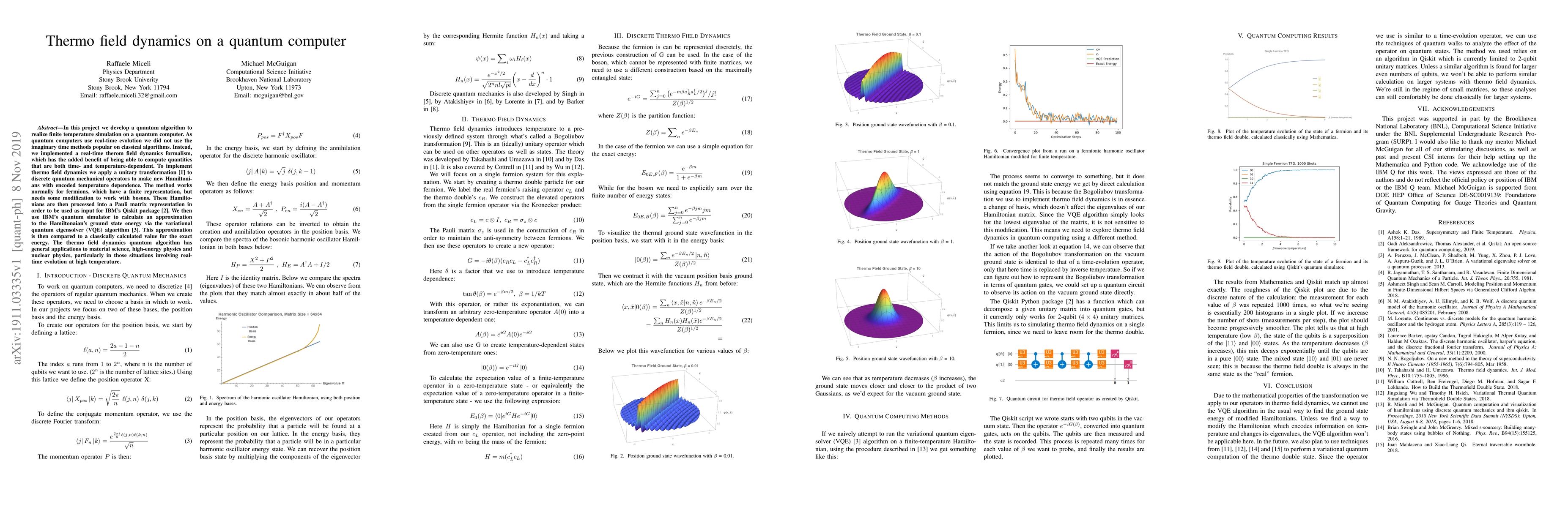 In this paper we develop a quantum algorithm to realize finite temperature simulation on a quantum computer. As quantum computers use real-time evolution we did not use the imaginary time methods popular on classical algorithms. Instead, we implemented a real-time thermo field dynamics formalism, which has the added benefit of being able to compute quantities that are both time- and temperature-dependent. To implement thermo field dynamics we apply a unitary transformation to discrete quantum mechanical operators to make new Hamiltonians with encoded temperature dependence. The method works normally for fermions, which have a finite representation, but needs some modification to work with bosons. These Hamiltonians are then processed into a Pauli matrix representation in order to be used as input for IBM's Qiskit package. We then use IBM's quantum simulator to calculate an approximation to the Hamiltonaian's ground state energy via the variational quantum eigensolver (VQE) algorithm. This approximation is then compared to a classically calculated value for the exact energy. The thermo field dynamics quantum algorithm has general applications to material science, high-energy physics and nuclear physics, particularly in those situations involving real-time evolution at high temperature.