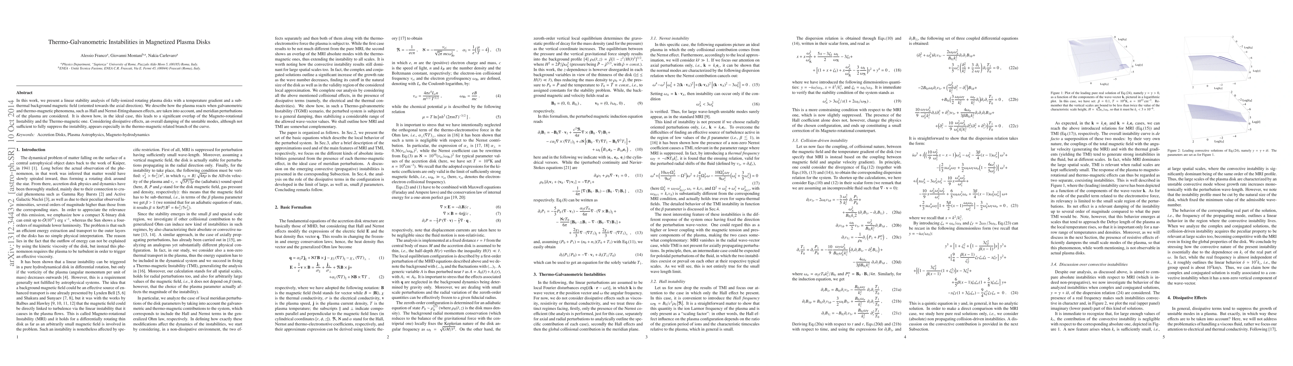 In this work, we present a linear stability analysis of fully-ionized rotating plasma disks with a temperature gradient and a sub-thermal background magnetic field (oriented towards the axial direction). We describe how the plasma reacts when galvanometric and thermo-magnetic phenomena, such as Hall and Nernst-Ettingshausen effects, are taken into account, and meridian perturbations of the plasma are considered. It is shown how, in the ideal case, this leads to a significant overlap of the Magneto-rotational Instability and the Thermo-magnetic one. Considering dissipative effects, an overall damping of the unstable modes, although not sufficient to fully suppress the instability, appears especially in the thermo-magnetic related branch of the curve.