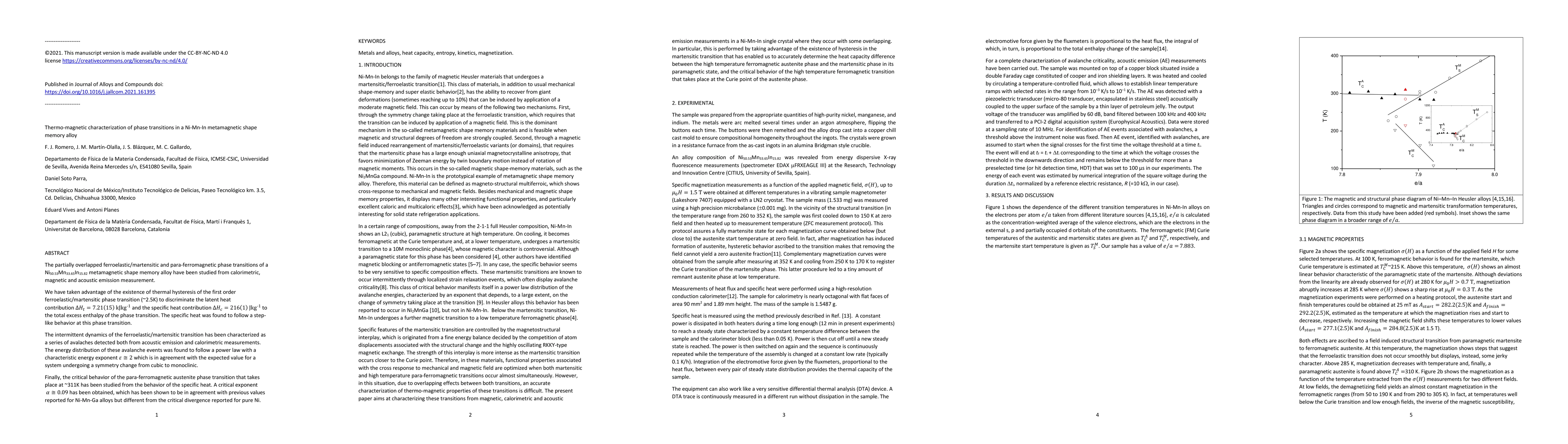 This study investigates the thermo-magnetic phase transitions in a Ni-Mn-In metamagnetic shape memory alloy using calorimetry, magnetic, and acoustic emission measurements. The research identifies distinct latent heat and specific heat contributions during the ferroelastic/martensitic transition, characterized by thermal hysteresis and step-like specific heat behavior, while the para-ferromagnetic transition exhibits a critical exponent consistent with other Ni-Mn-Ga alloys.