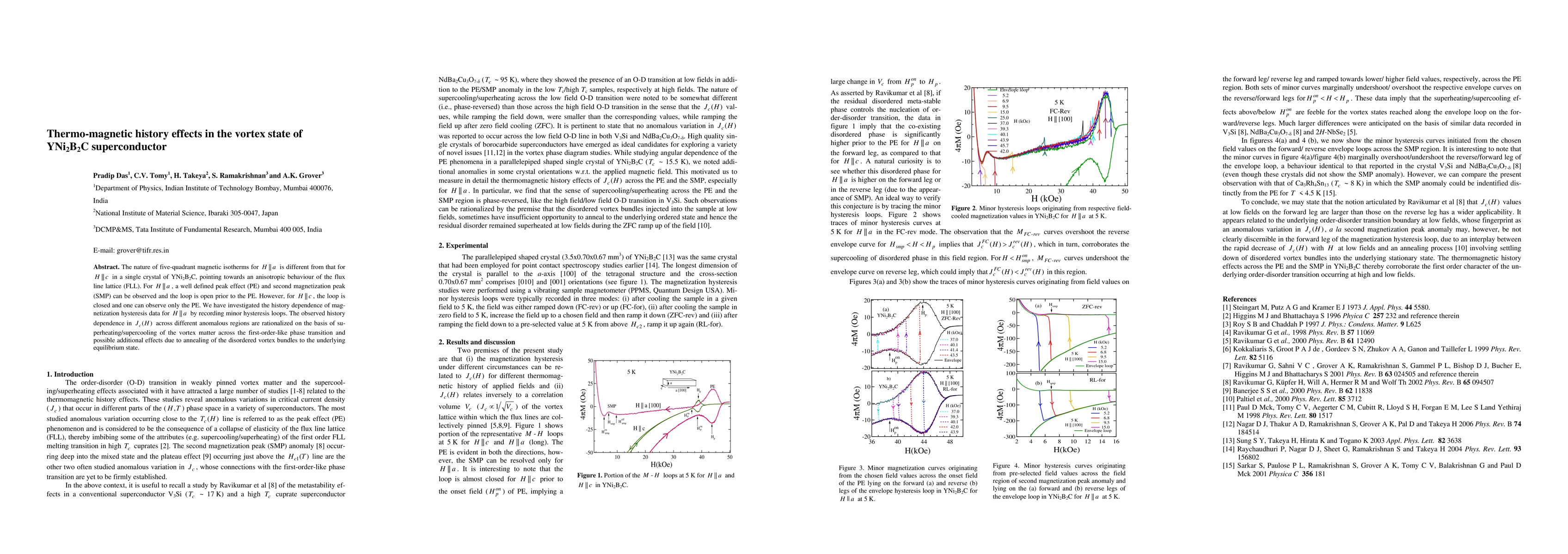 The nature of five-quadrant magnetic isotherms for is different from that for in a single crystal of YNi2B2C, pointing towards an anisotropic behaviour of the flux line lattice (FLL). For, a well defined peak effect (PE) and second magnetization peak (SMP) can be observed and the loop is open prior to the PE. However, for, the loop is closed and one can observe only the PE. We have investigated the history dependence of magnetization hysteresis data for by recording minor hysteresis loops. The observed history dependence in across different anomalous regions are rationalized on the basis of su-perheating/supercooling of the vortex matter across the first-order-like phase transition and possible additional effects due to annealing of the disordered vortex bundles to the underlying equilibrium state.