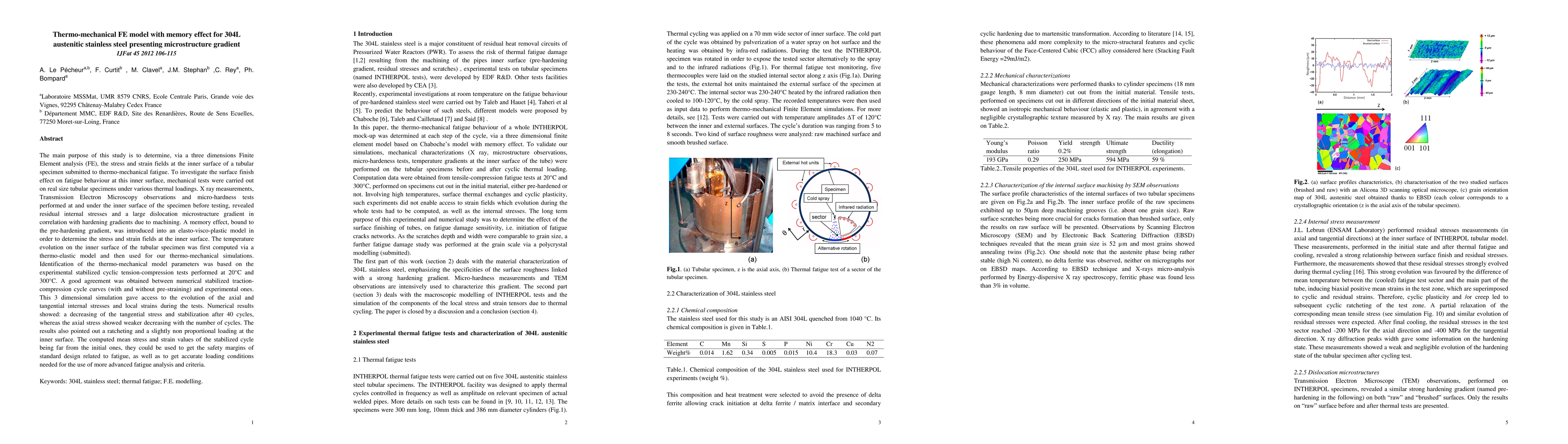 The main purpose of this study is to determine, via a three dimensions Finite Element analysis (FE), the stress and strain fields at the inner surface of a tubular specimen submitted to thermo-mechanical fatigue. To investigate the surface finish effect on fatigue behaviour at this inner surface, mechanical tests were carried out on real size tubular specimens under various thermal loadings. X ray measurements, Transmission Electron Microscopy observations and micro-hardness tests performed at and under the inner surface of the specimen before testing, revealed residual internal stresses and a large dislocation microstructure gradient in correlation with hardening gradients due to machining. A memory effect, bound to the pre-hardening gradient, was introduced into an elasto-visco-plastic model in order to determine the stress and strain fields at the inner surface. The temperature evolution on the inner surface of the tubular specimen was first computed via a thermo-elastic model and then used for our thermo-mechanical simulations. Identification of the thermo-mechanical model parameters was based on the experimental stabilized cyclic tension-compression tests performed at 20^{\circ}C and 300^{\circ}C. A good agreement was obtained between numerical stabilized traction-compression cycle curves (with and without pre-straining) and experimental ones. This 3 dimensional simulation gave access to the evolution of the axial and tangential internal stresses and local strains during the tests. Numerical results showed: a decreasing of the tangential stress and stabilization after 40 cycles, whereas the axial stress showed weaker decreasing with the number of cycles. The results also pointed out a ratcheting and a slightly non proportional loading at the inner surface. The computed mean stress and strain values of the stabilized cycle being far from the initial ones, they could be used to get the safety margins of standard design related to fatigue, as well as to get accurate loading conditions needed for the use of more advanced fatigue analysis and criteria.