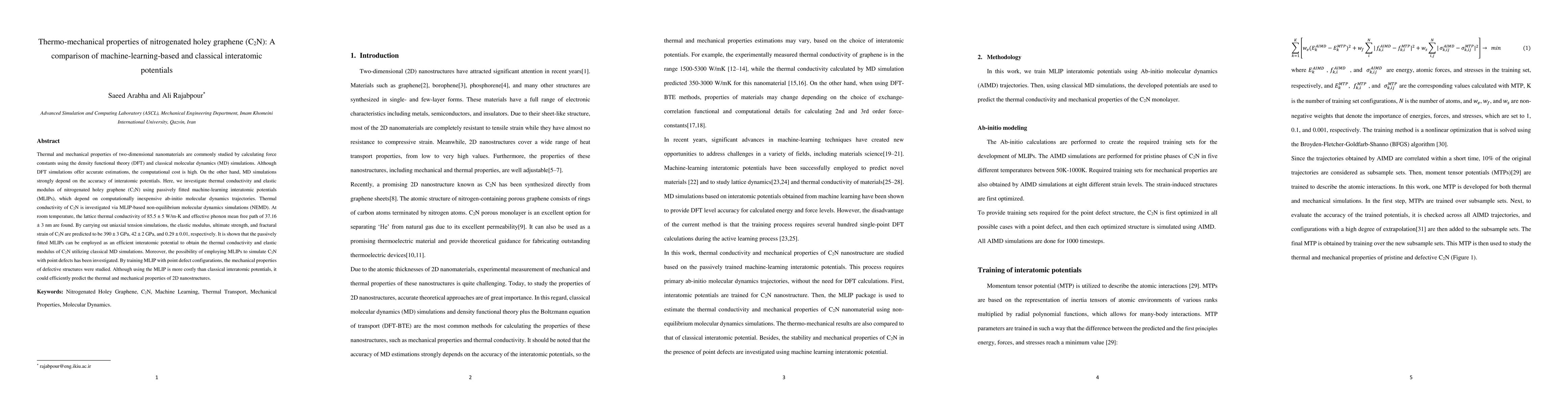 This study compares machine-learning-based interatomic potentials (MLIPs) with classical methods to evaluate the thermal and mechanical properties of nitrogenated holey graphene (C2N). MLIPs, derived from ab-initio molecular dynamics, predict a lattice thermal conductivity of 85.5 W/m-K and an elastic modulus of 390 GPa, demonstrating their efficiency in simulating 2D nanomaterials.