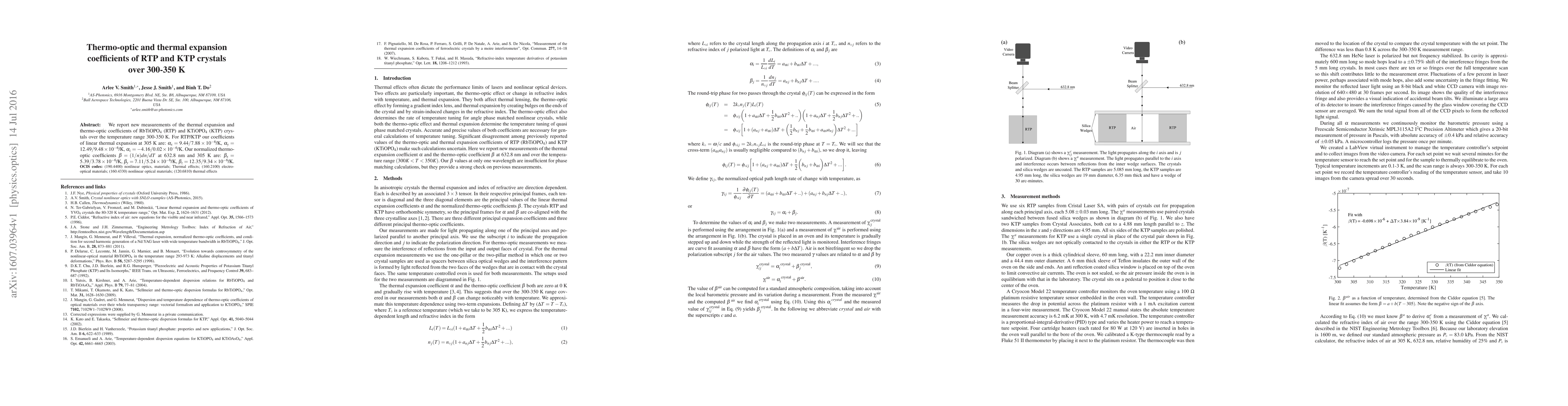 We report new measurements of the thermal expansion and thermo-optic coefficients of RbTiOPO$_4$ (RTP) and KTiOPO$_4$ (KTP) crystals over the temperature range 300-350 K. For RTP/KTP our coefficients of linear thermal expansion at 305 K are: $\alpha_x=9.44/7.88\times 10^{-6}$/K, $\alpha_y=12.49/9.48\times 10^{-6}$/K, $\alpha_z=-4.16/0.02\times 10^{-6}$/K. Our normalized thermo-optic coefficients $\beta=(1/n)dn/dT$ at 632.8 nm and 305 K are: $\beta_x=5.39/3.78\times 10^{-6}$/K, $\beta_y=7.11/5.24\times 10^{-6}$/K, $\beta_z=12.35/9.34\times 10^{-6}$/K.