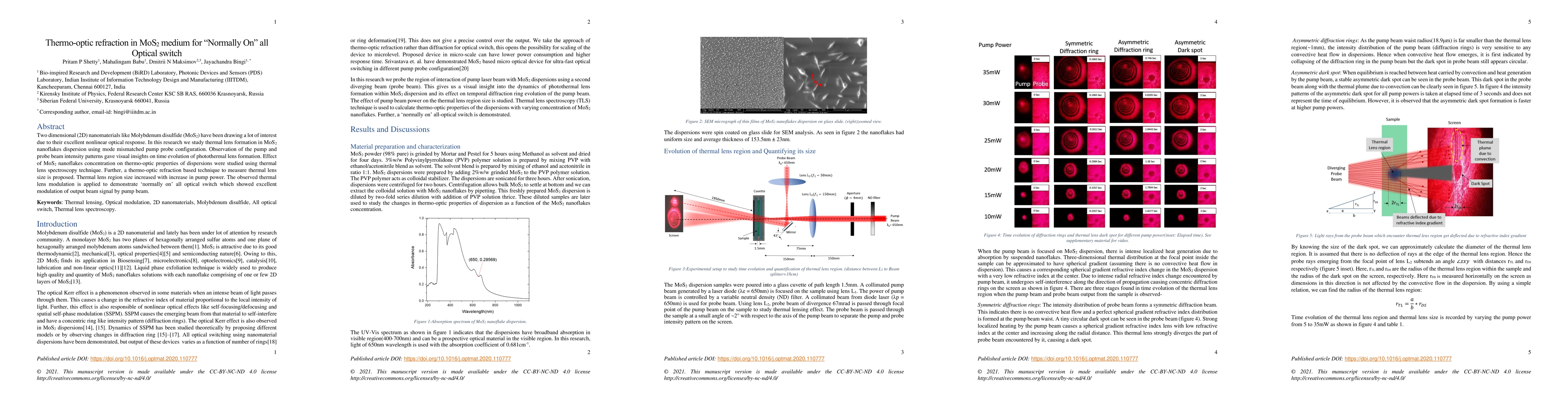 This research investigates the thermo-optic refraction in MoS2 nanoflakes for an all-optical switch, demonstrating the modulation of output beam intensity by a pump beam through thermal lens formation and size measurement using a mode mismatched pump-probe configuration. The study shows that increasing pump power enlarges the thermal lens, enabling effective 'normally on' optical switching.