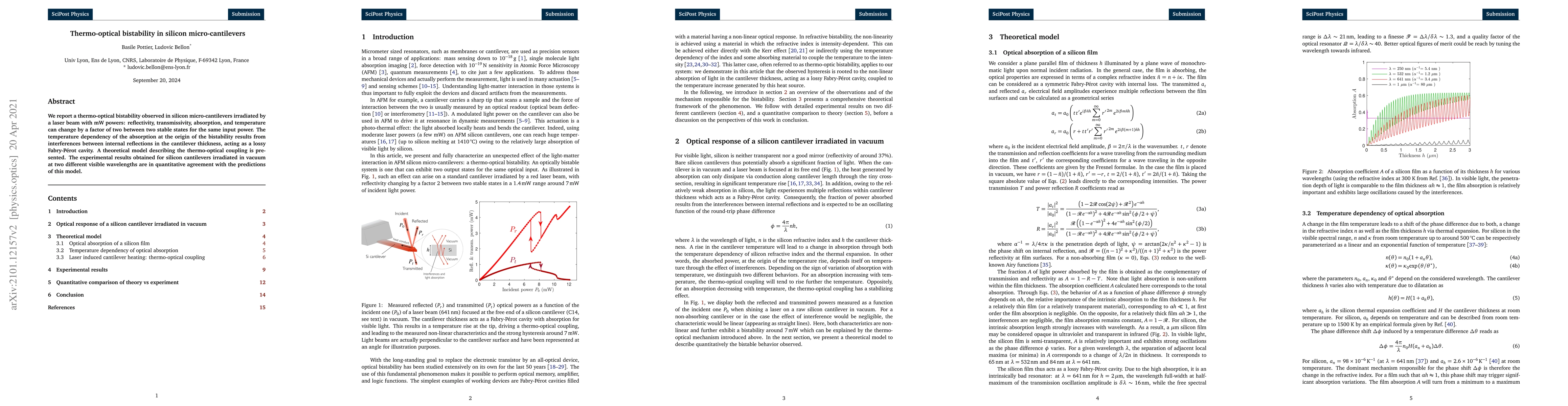 This paper reports thermo-optical bistability in silicon micro-cantilevers, where reflectivity, transmissivity, absorption, and temperature can switch between two stable states under the same input power. The bistability arises from interference effects within the cantilever acting as a lossy Fabry-Pérot cavity.