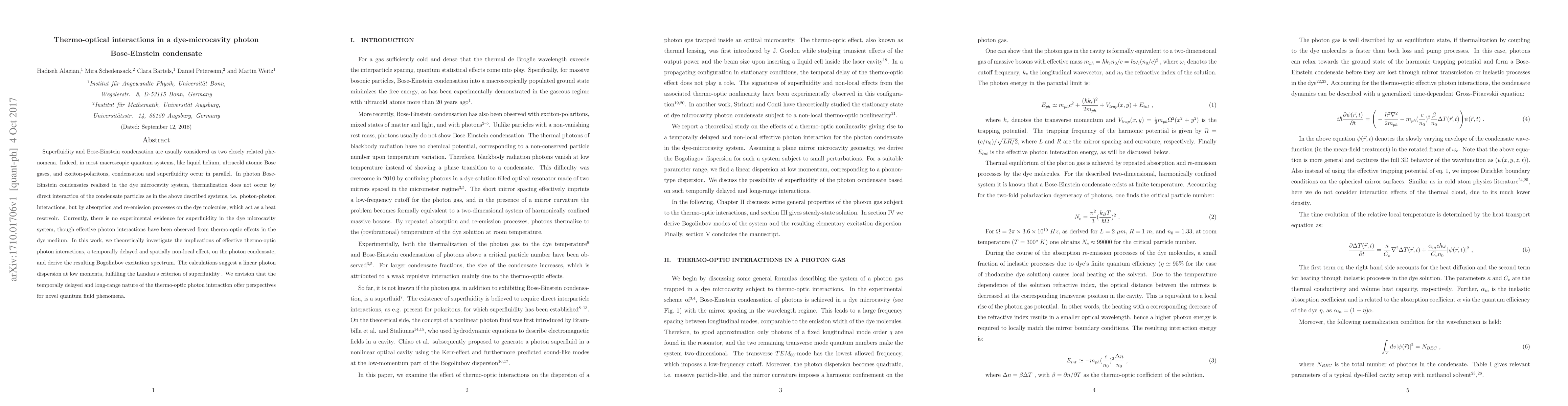This paper investigates the thermo-optical interactions in dye-microcavity photon Bose-Einstein condensates, revealing effective photon interactions through dye molecules. The study derives a Bogoliubov excitation spectrum suggesting linear photon dispersion, supporting the possibility of superfluidity in these systems.