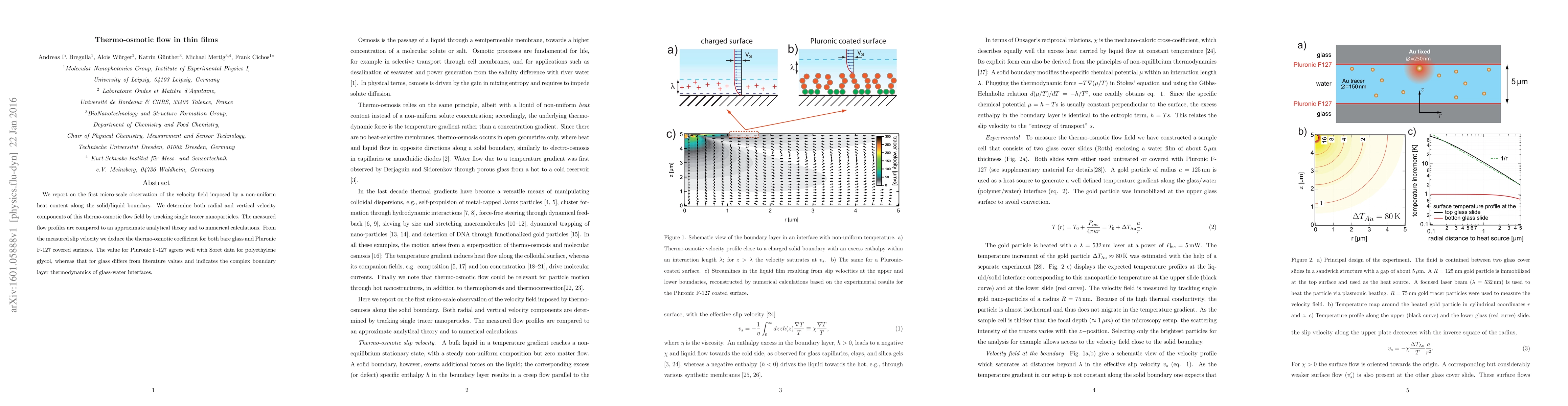 This paper reports on the first micro-scale observation of thermo-osmotic flow in thin films, determining radial and vertical velocity components via nanoparticle tracking. The study compares measured flow profiles with analytical theory and numerical calculations, revealing distinct thermo-osmotic coefficients for bare glass and Pluronic F-127 surfaces.