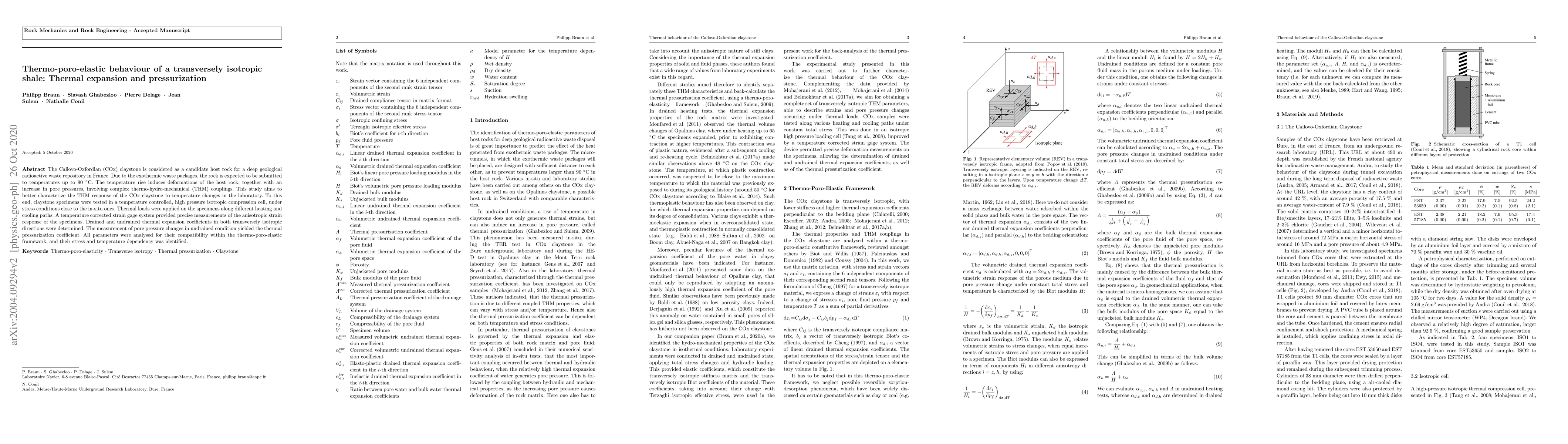 This study investigates the thermo-poro-elastic behavior of Callovo-Oxfordian claystone, a candidate host rock for radioactive waste disposal, under temperature variations up to 90°C. It characterizes the rock's THM response through laboratory tests, determining thermal expansion and pressurization coefficients, and analyzing their dependency on stress and temperature.