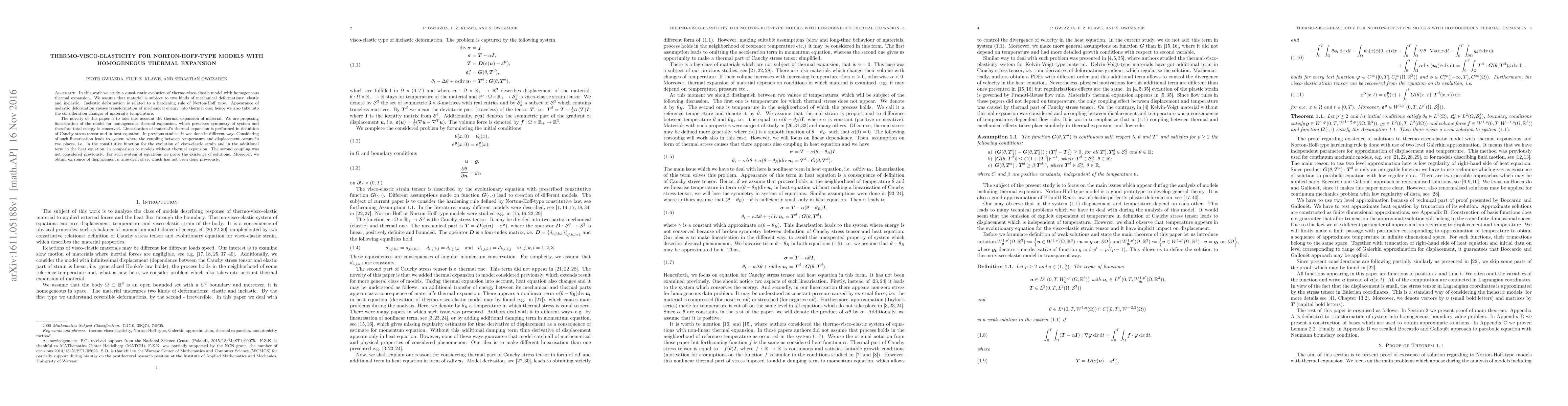 Researchers study a new model for materials with homogeneous thermal expansion, incorporating two types of mechanical deformations and energy transformation into heat, proving the existence of solutions and the displacement's time derivative.