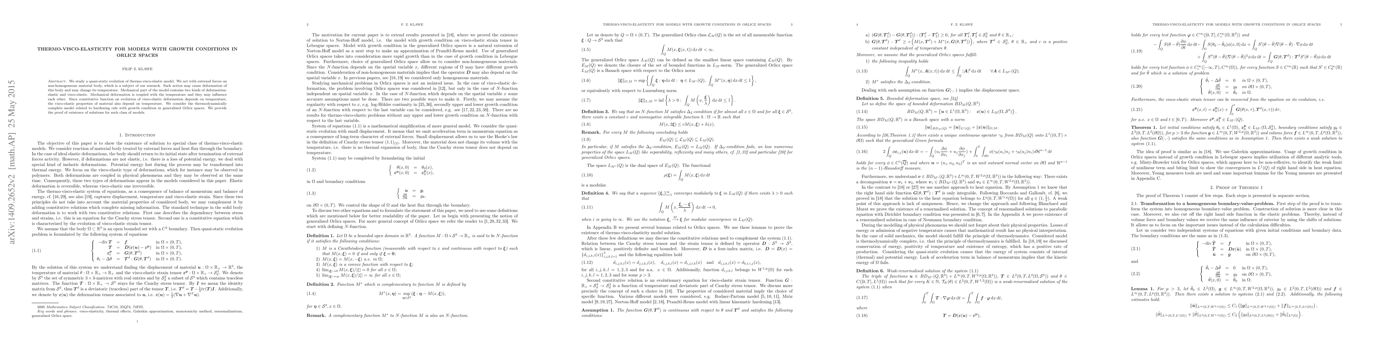 We study a quasi-static evolution of thermo-visco-elastic model. We act with external forces on non-homogeneous material body, which is a subject of our research. Such action may cause deformation of this body and may change its temperature. Mechanical part of the model contains two kinds of deformation: elastic and visco-elastic. Mechanical deformation is coupled with the temperature and they may influence each other. Since constitutive function on evolution of visco-elastic deformation depends on temperature, the visco-elastic properties of material also depend on temperature. We consider the thermodynamically complete model related to hardening rule with growth condition in generalized Orlicz spaces. We provide the proof of existence of solutions for such class of models.