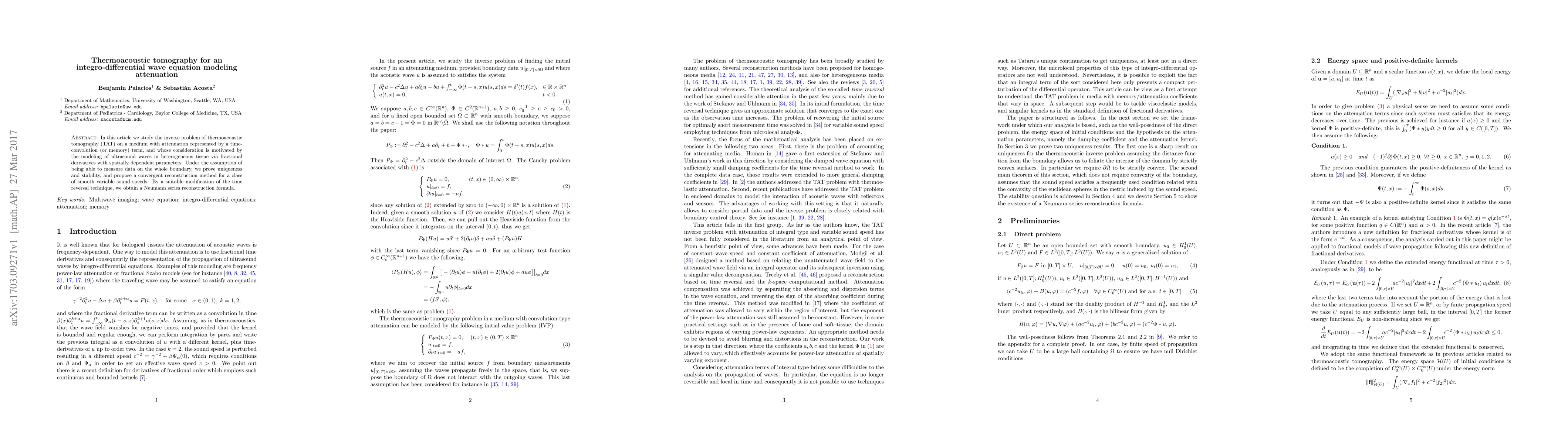 In this article we study the inverse problem of thermoacoustic tomography (TAT) on a medium with attenuation represented by a time- convolution (or memory) term, and whose consideration is motivated by the modeling of ultrasound waves in heterogeneous tissue via fractional derivatives with spatially dependent parameters. Under the assumption of being able to measure data on the whole boundary, we prove uniqueness and stability, and propose a convergent reconstruction method for a class of smooth variable sound speeds. By a suitable modification of the time reversal technique, we obtain a Neumann series reconstruction formula.