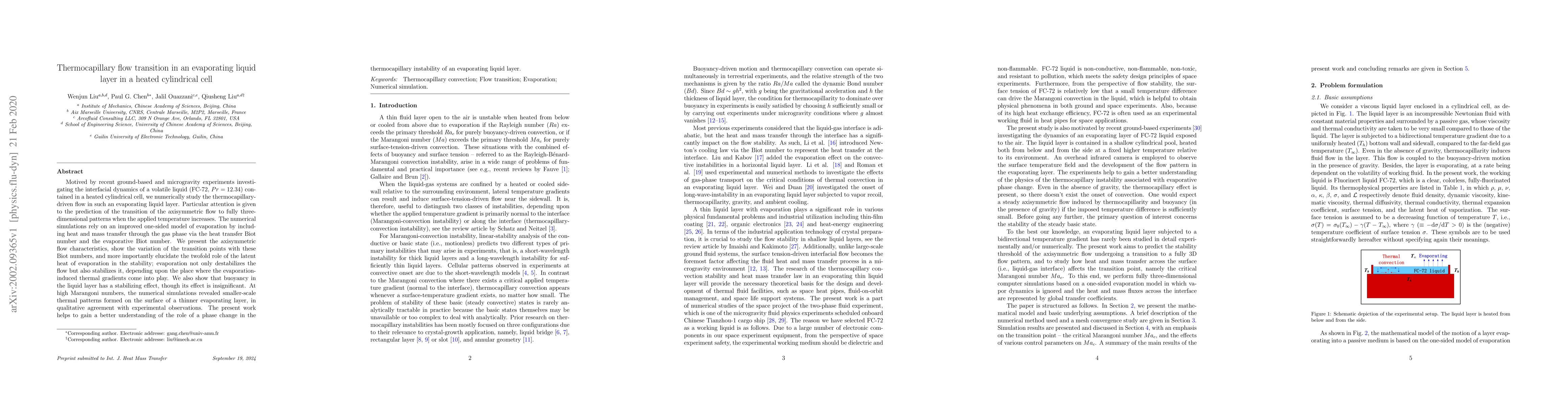 Motived by recent ground-based and microgravity experiments investigating the interfacial dynamics of a volatile liquid (FC-72, $Pr=12.34$) contained in a heated cylindrical cell, we numerically study the thermocapillary-driven flow in such an evaporating liquid layer. Particular attention is given to the prediction of the transition of the axisymmetric flow to fully three-dimensional patterns when the applied temperature increases. The numerical simulations rely on an improved one-sided model of evaporation by including heat and mass transfer through the gas phase via the heat transfer Biot number and the evaporative Biot number. We present the axisymmetric flow characteristics, show the variation of the transition points with these Biot numbers, and more importantly elucidate the twofold role of the latent heat of evaporation in the stability; evaporation not only destabilizes the flow but also stabilizes it, depending upon the place where the evaporation-induced thermal gradients come into play. We also show that buoyancy in the liquid layer has a stabilizing effect, though its effect is insignificant. At high Marangoni numbers, the numerical simulations revealed smaller-scale thermal patterns formed on the surface of a thinner evaporating layer, in qualitative agreement with experimental observations. The present work helps to gain a better understanding of the role of a phase change in the thermocapillary instability of an evaporating liquid layer.