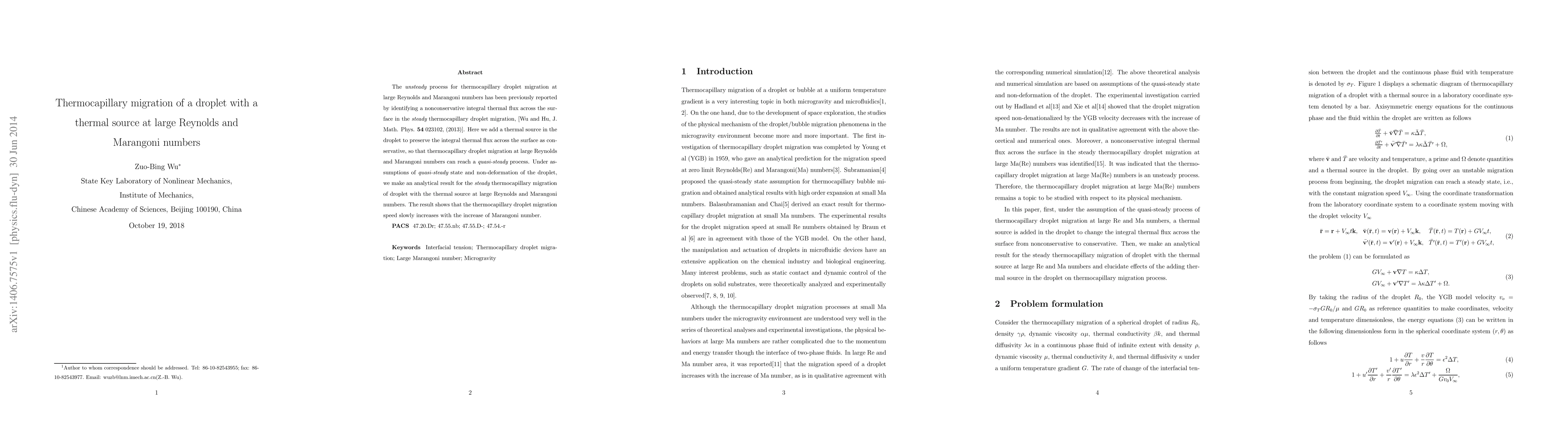 This paper investigates the unsteady thermocapillary migration of a droplet with an internal thermal source at large Reynolds and Marangoni numbers, achieving a quasi-steady process. Analytical results show that the droplet migration speed gradually increases with higher Marangoni numbers under quasi-steady state assumptions.