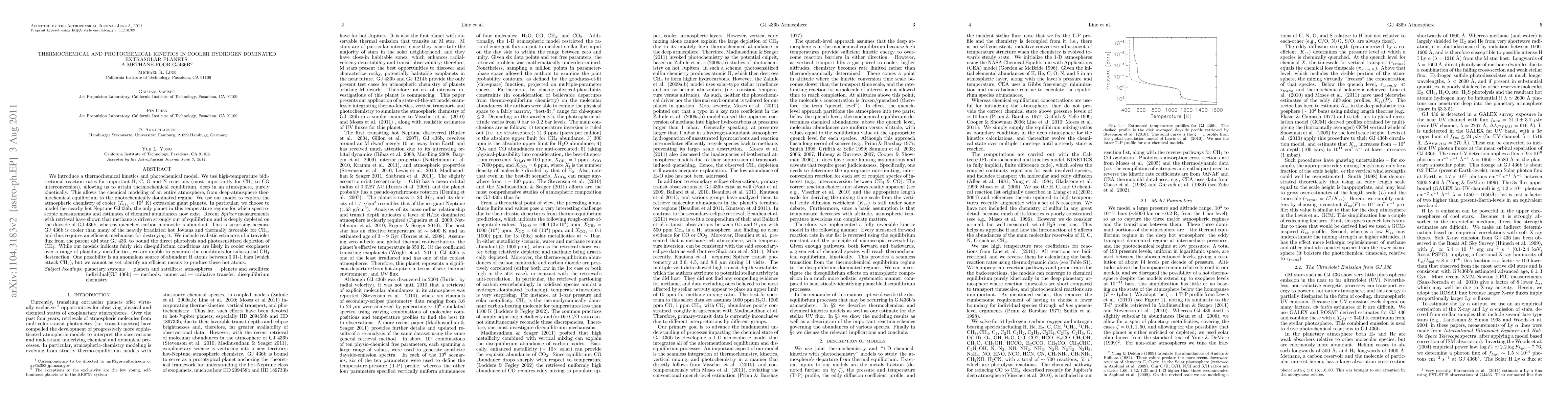 We introduce a new thermochemical kinetics and photochemical model. We use high-temperature bidirectional reaction rates for important H, C, O and N reactions (most importantly for CH$_4$ to CO interconversion), allowing us to attain thermochemical equilibrium, deep in an atmosphere, purely kinetically. This allows ab initio chemical modeling of an entire atmosphere, from deep-atmosphere thermochemical equilibrium to the photochemically dominated regime. We use our model to explore the atmospheric chemistry of cooler ($T_{eff} < 10^3$ K) extrasolar giant planets. In particular, we choose to model the nearby hot Neptune GJ436b, the only planet in this temperature regime for which spectroscopic measurements and estimates of chemical abundances now exist. Recent {\it Spitzer} measurements with retrieval have shown that methane is driven strongly out of equilibrium and is deeply depleted on the dayside of GJ 436b, whereas quenched carbon monoxide is abundant. This is surprising because GJ 436b is cooler than many of the heavily irradiated hot Jovians and thermally favorable for CH$_4$, and thus requires an efficient mechanism for destroying it. We include realistic estimates of ultraviolet flux from the parent dM star GJ 436, to bound the direct photolysis and photosensitized depletion of CH$_4$. While our models indicate fairly rich disequilibrium conditions are likely in cooler exoplanets over a range of planetary metallicities, we are unable to generate the conditions for substantial CH$_4$ destruction. One possibility is an anomalous source of abundant H atoms between 0.01-1 bars (which attack CH$_4$), but we cannot as yet identify an efficient means to produce these hot atoms.