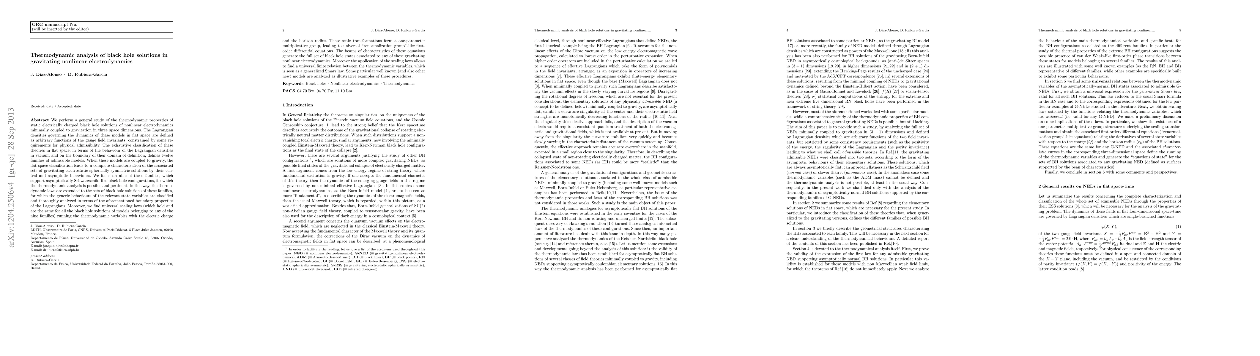 We perform a general study of the thermodynamic properties of static electrically charged black hole solutions of nonlinear electrodynamics minimally coupled to gravitation in three space dimensions. The Lagrangian densities governing the dynamics of these models in flat space are defined as arbitrary functions of the gauge field invariants, constrained by some requirements for physical admissibility. The exhaustive classification of these theories in flat space, in terms of the behaviour of the Lagrangian densities in vacuum and on the boundary of their domain of definition, defines twelve families of admissible models. When these models are coupled to gravity, the flat space classification leads to a complete characterization of the associated sets of gravitating electrostatic spherically symmetric solutions by their central and asymptotic behaviours. We focus on nine of these families, which support asymptotically Schwarzschild-like black hole configurations, for which the thermodynamic analysis is possible and pertinent. In this way, the thermodynamic laws are extended to the sets of black hole solutions of these families, for which the generic behaviours of the relevant state variables are classified and thoroughly analyzed in terms of the aforementioned boundary properties of the Lagrangians. Moreover, we find universal scaling laws (which hold and are the same for all the black hole solutions of models belonging to any of the nine families) running the thermodynamic variables with the electric charge and the horizon radius. These scale transformations form a one-parameter multiplicative group, leading to universal "renormalization group"-like first-order differential equations. The beams of characteristics of these equations generate the full set of black hole states associated to any of these gravitating nonlinear electrodynamics...