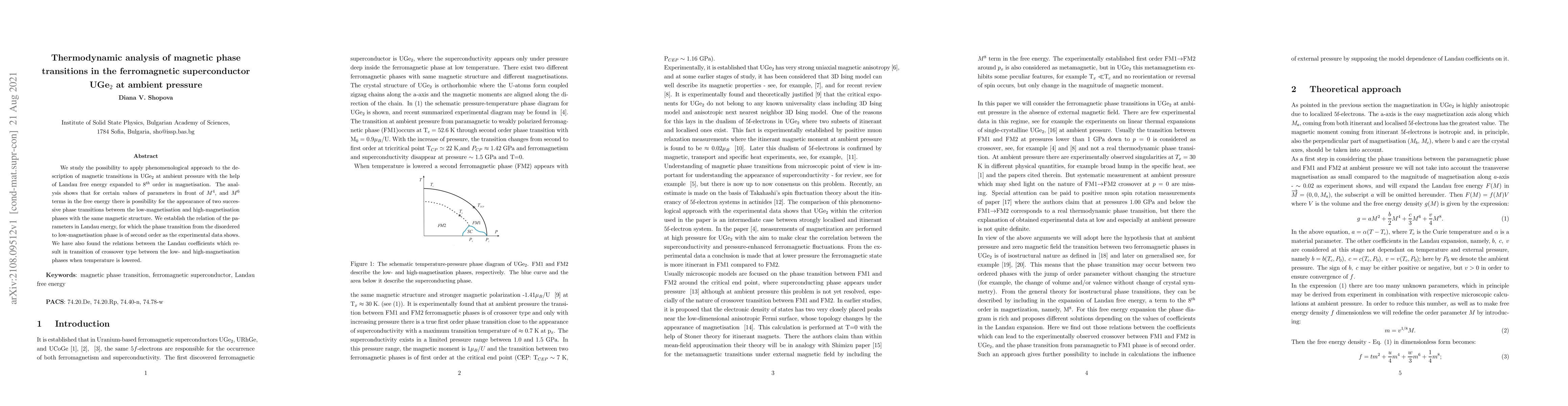 We study the possibility to apply phenomenological approach to the description of magnetic transitions in UGe$_2$ at ambient pressure with the help of Landau free energy expanded to 8th order in magnetisation. The analysis shows that for certain values of parameters in front of M4, and M6 terms in the free energy there is possibility for the appearance of two successive phase transitions between the low-magnetisation and high-magnetisation phases with the same magnetic structure. We establish the relation of the parameters in Landau energy, for which the phase transition from the disordered to low-magnetisation phase is of second order as the experimental data shows. We have also found the relations between the Landau coefficients which result in transition of crossover type between the low- and high-magnetisation phases when temperature is lowered.