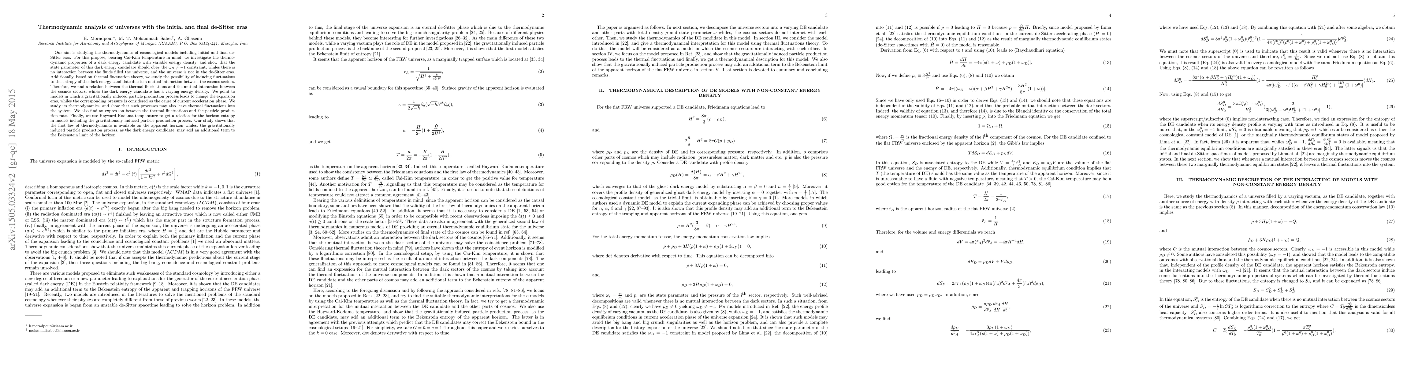 Our aim is studying the thermodynamics of cosmological models including initial and final de-Sitter eras. For this propose, bearing Cai-Kim temperature in mind, we investigate the thermodynamic properties of a dark energy candidate with variable energy density, and show that the state parameter of this dark energy candidate should obey the $\omega_D\neq-1$ constraint, whiles there is no interaction between the fluids filled the universe, and the universe is not in the de-Sitter eras. Additionally, based on thermal fluctuation theory, we study the possibility of inducing fluctuations to the entropy of the dark energy candidate due to a mutual interaction between the cosmos sectors. Therefore, we find a relation between the thermal fluctuations and the mutual interaction between the cosmos sectors, whiles the dark energy candidate has a varying energy density. We point to models in which a gravitationally induced particle production process leads to change the expansion eras, whiles the corresponding pressure is considered as the cause of current acceleration phase. We study its thermodynamics, and show that such processes may also leave thermal fluctuations into the system. We also find an expression between the thermal fluctuations and the particle production rate. Finally, we use Hayward-Kodama temperature to get a relation for the horizon entropy in models including the gravitationally induced particle production process. Our study shows that the first law of thermodynamics is available on the apparent horizon whiles, the gravitationally induced particle production process, as the dark energy candidate, may add an additional term to the Bekenstein limit of the horizon.