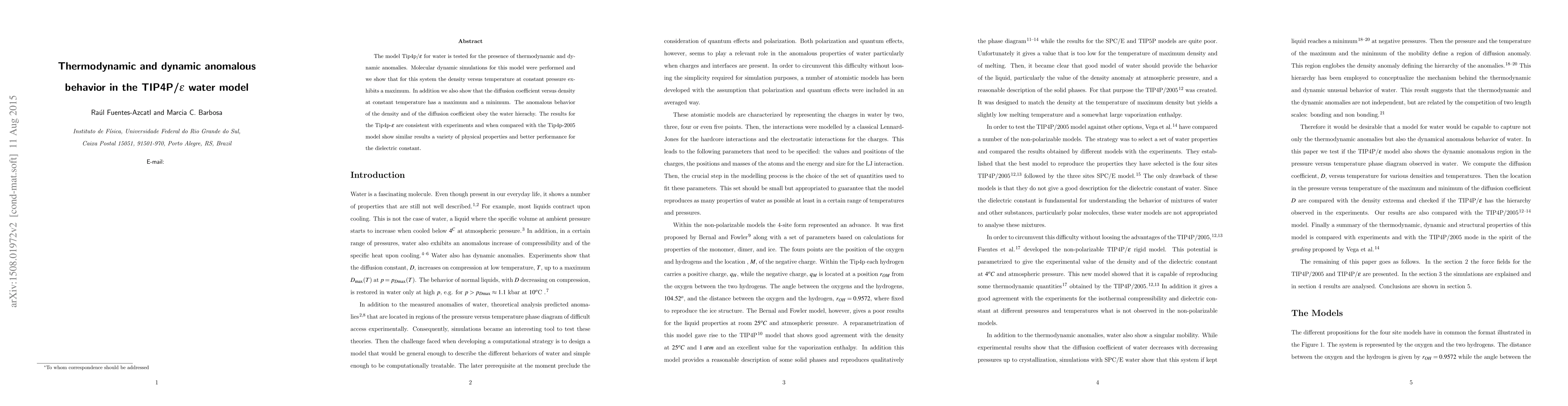 This study investigates thermodynamic and dynamic anomalies in the TIP4P/ε water model through molecular dynamics simulations, revealing a maximum in density versus temperature and a complex pattern in the diffusion coefficient versus density. The findings align with experimental data and demonstrate improved performance for the dielectric constant compared to the TIP4P-2005 model.