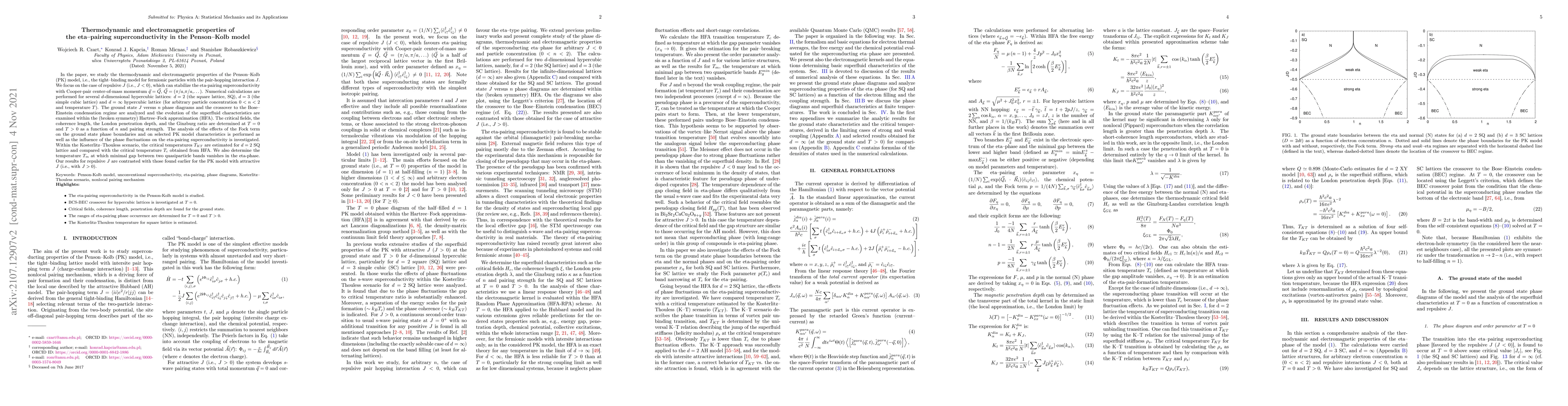 This paper investigates the thermodynamic and electromagnetic properties of eta-pairing superconductivity in the Penson-Kolb model, focusing on repulsive pair-hopping interactions. It analyzes the model across various dimensions, determining critical fields, coherence length, and penetration depth, and compares results with earlier studies on attractive interactions.