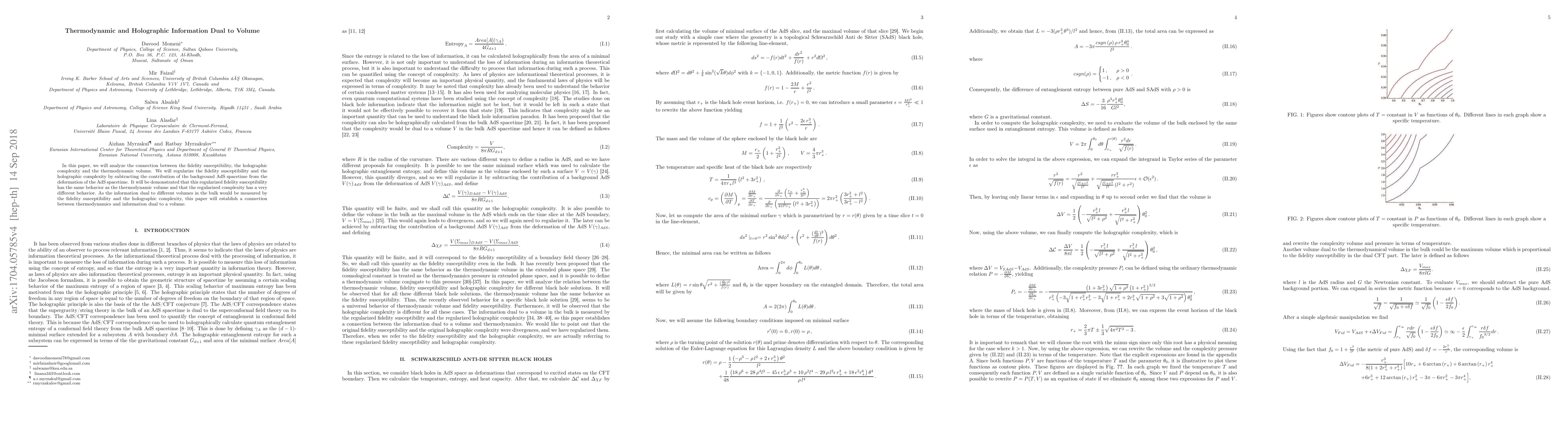 In this paper, we will analyze the connection between the fidelity susceptibility, the holographic complexity and the thermodynamic volume. We will regularize the fidelity susceptibility and the holographic complexity by subtracting the contribution of the background AdS spacetime from the deformation of the AdS spacetime. It will be demonstrated that this regularized fidelity susceptibility has the same behavior as the thermodynamic volume and that the regularized complexity has a very different behavior. As the information dual to different volumes in the bulk would be measured by the fidelity susceptibility and the holographic complexity, this paper will establish a connection between thermodynamics and information dual to a volume.