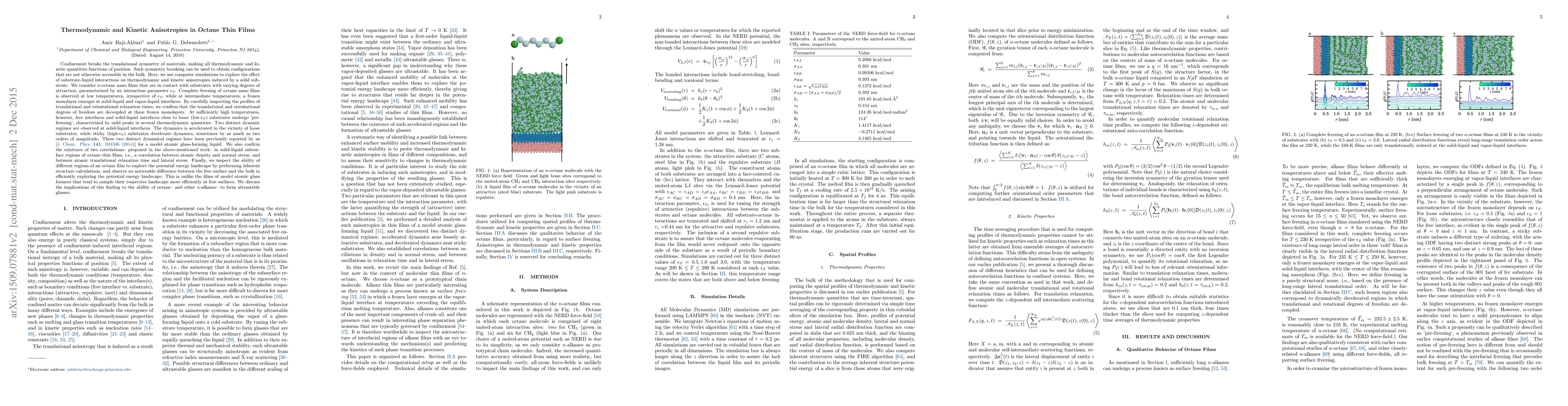 This study investigates the thermodynamic and kinetic anisotropies in n-octane thin films due to substrate-liquid interactions, revealing distinct freezing behaviors and dynamic regimes influenced by substrate attraction. The research confirms decoupling of translational and orientational degrees of freedom in frozen monolayers and identifies two distinct dynamic regimes, with substrate type significantly affecting relaxation dynamics.