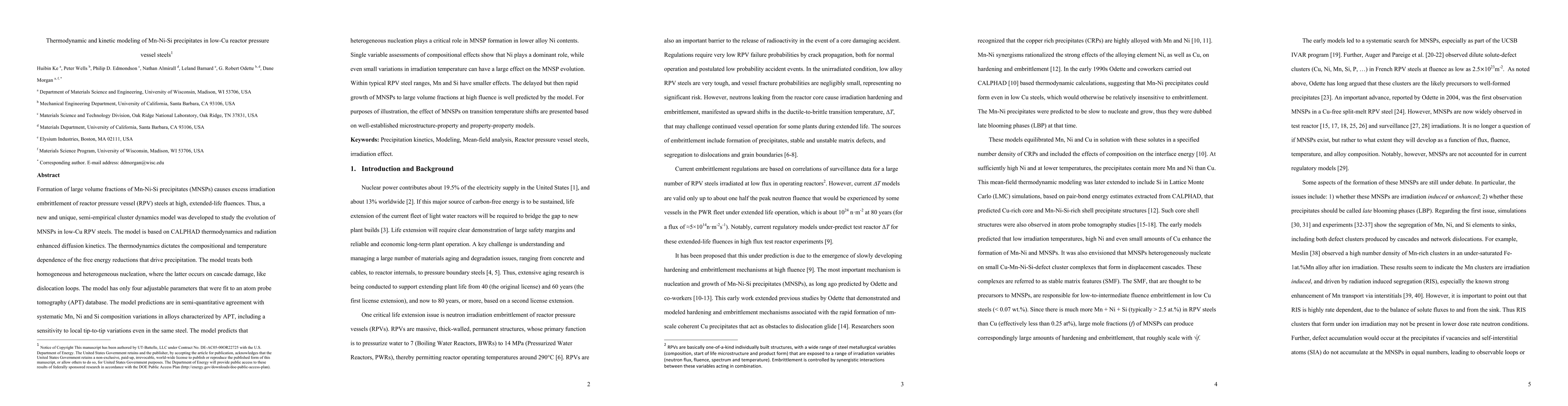 Formation of large volume fractions of Mn-Ni-Si precipitates (MNSPs) causes excess irradiation embrittlement of reactor pressure vessel (RPV) steels at high, extended-life fluences. Thus, a new and unique, semi-empirical cluster dynamics model was developed to study the evolution of MNSPs in low- Cu RPV steels. The model is based on CALPHAD thermodynamics and radiation enhanced diffusion ki- netics. The thermodynamics dictates the compositional and temperature dependence of the free energy reductions that drive precipitation. The model treats both homogeneous and heterogeneous nucleation, where the latter occurs on cascade damage, like dislocation loops. The model has only four adjustable parameters that were fit to an atom probe tomography (APT) database. The model predictions are in semi-quantitative agreement with systematic Mn, Ni and Si composition variations in alloys character- ized by APT, including a sensitivity to local tip-to-tip variations even in the same steel. The model predicts that heterogeneous nucleation plays a critical role in MNSP formation in lower alloy Ni contents. Single variable assessments of compositional effects show that Ni plays a dominant role, while even small variations in irradiation temperature can have a large effect on theMNSP evolution. Within typical RPV steel ranges, Mn and Si have smaller effects. The delayed but then rapid growth of MNSPs to large volume fractions at high fluence is well predicted by the model. For purposes of illustration, the effect of MNSPs on transition temperature shifts are presented based on well-established microstructure-prop- erty and property-property models.