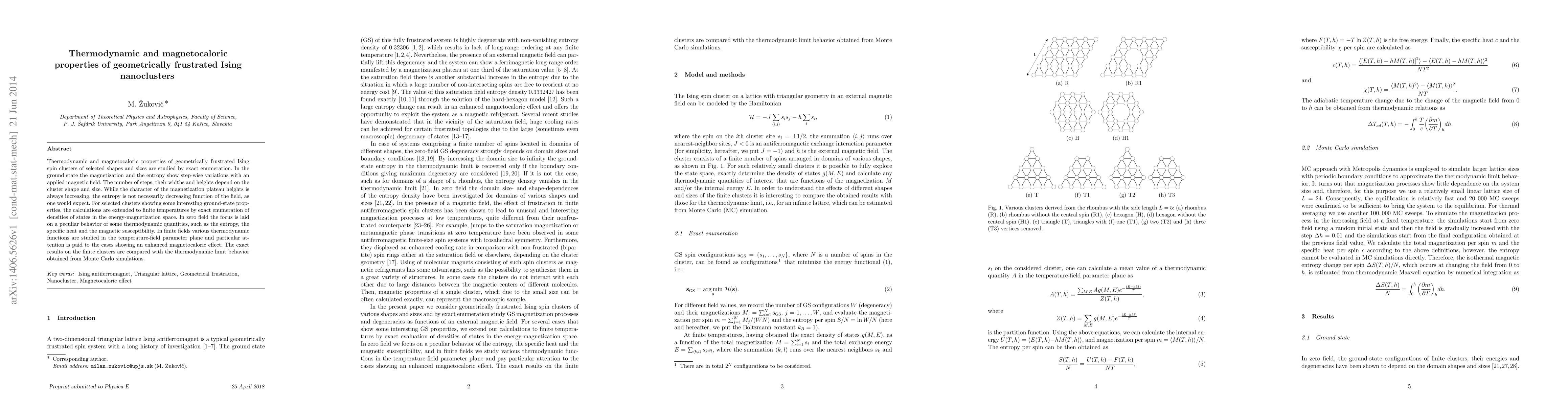 This research investigates the thermodynamic and magnetocaloric properties of geometrically frustrated Ising nanoclusters through exact enumeration, revealing step-wise variations in magnetization and entropy with applied magnetic fields. The study highlights the dependence of these variations on cluster shape and size, and explores interesting ground-state and finite-temperature behaviors, with a focus on clusters showing enhanced magnetocaloric effects.