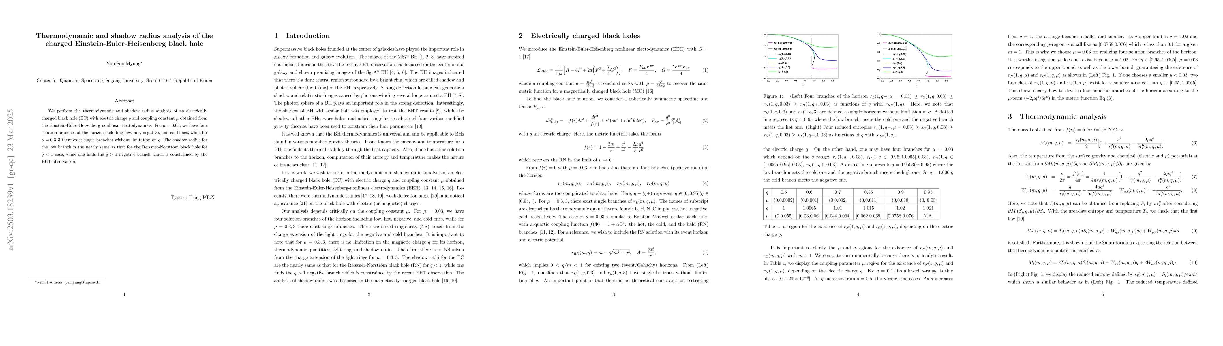 This paper analyzes thermodynamic properties and shadow radius of a charged black hole derived from Einstein-Euler-Heisenberg nonlinear electrodynamics. It identifies four solution branches for a specific coupling constant, while other values yield a single branch, and discusses the shadow radius in relation to the EHT observation.