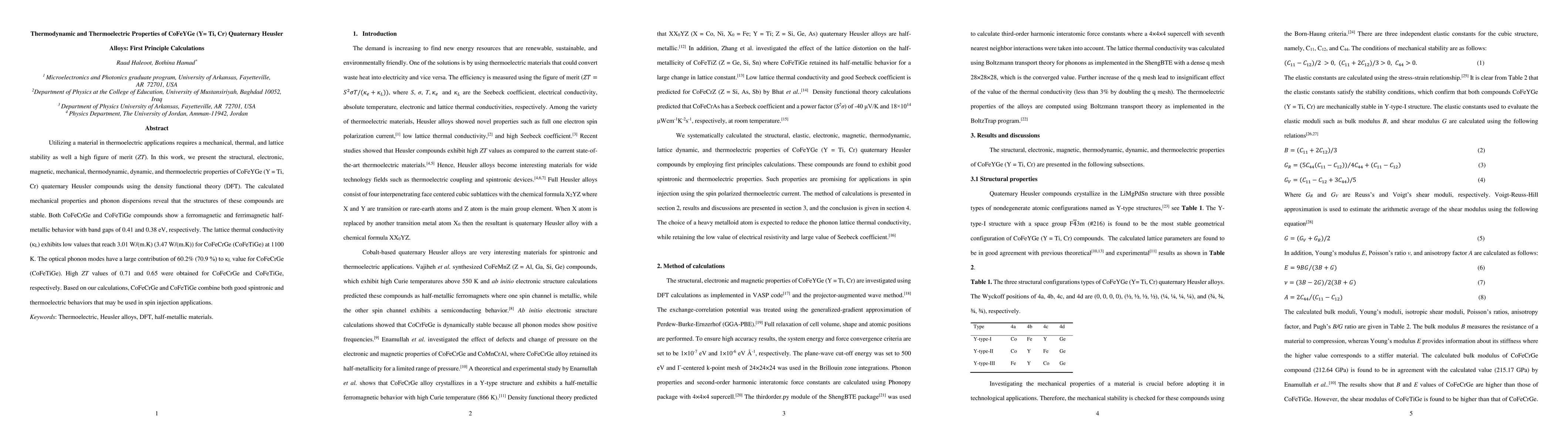 The paper presents a detailed investigation of the electronic, magnetic, and thermoelectric properties of CoFeYGe (Y = Ti, Cr) quaternary Heusler compounds using DFT calculations and semiclassical transport theory.