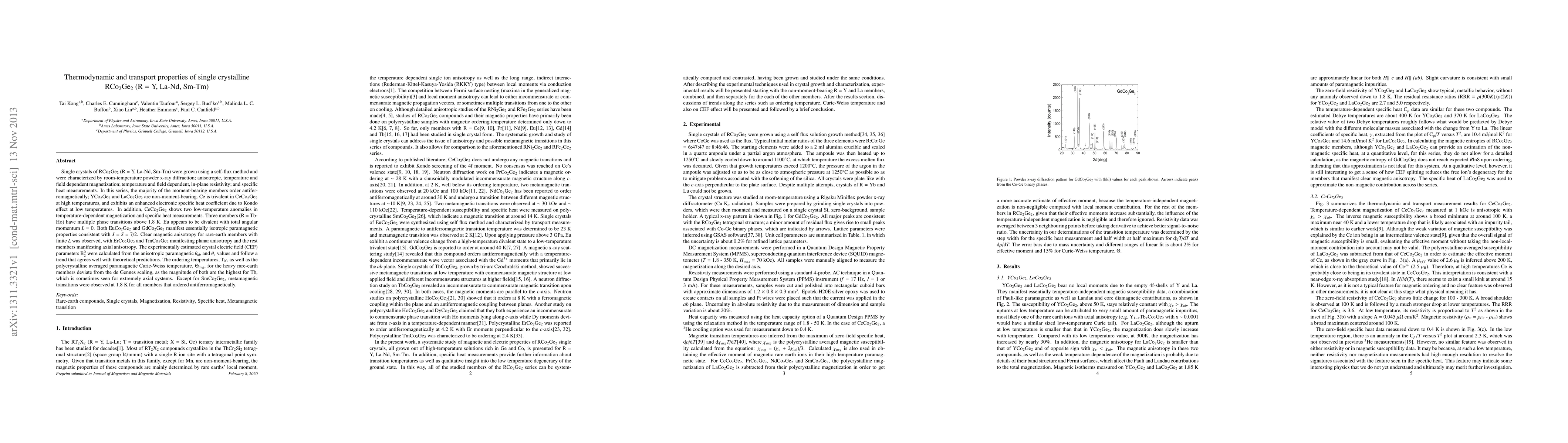 Single crystals of RCo$_{2}$Ge$_{2}$ (R = Y, La-Nd, Sm-Tm) were grown using a self-flux method and were characterized by room-temperature powder x-ray diffraction; anisotropic, temperature and field dependent magnetization; temperature and field dependent, in-plane resistivity; and specific heat measurements. In this series, the majority of the moment-bearing members order antiferromagnetically; YCo$_{2}$Ge$_{2}$ and LaCo$_{2}$Ge$_{2}$ are non-moment-bearing. Ce is trivalent in CeCo$_{2}$Ge$_{2}$ at high temperatures, and exhibits an enhanced electronic specific heat coefficient due to Kondo effect at low temperatures. In addition, CeCo$_{2}$Ge$_{2}$ shows two low-temperature anomalies in temperature-dependent magnetization and specific heat measurements. Three members (R = Tb-Ho) have multiple phase transitions above 1.8 K. Eu appears to be divalent with total angular momentum L = 0. Both EuCo$_{2}$Ge$_{2}$ and GdCo$_{2}$Ge$_{2}$ manifest essentially isotropic paramagnetic properties consistent with J = S = 7/2. Clear magnetic anisotropy for rare-earth members with finite L was observed, with ErCo$_{2}$Ge$_{2}$ and TmCo$_{2}$Ge$_{2}$ manifesting planar anisotropy and the rest members manifesting axial anisotropy. The experimentally estimated crystal electric field (CEF) parameters B$_{2}^{0}$ were calculated from the anisotropic paramagnetic $\theta_{ab}$ and $\theta_{c}$ values and follow a trend that agrees well with theoretical predictions. The ordering temperatures, T$_{N}$, as well as the polycrystalline averaged paramagnetic Curie-Weiss temperature, $\Theta_{avg}$, for the heavy rare-earth members deviate from the de Gennes scaling, as the magnitude of both are the highest for Tb, which is sometimes seen for extremely axial systems. Except for SmCo$_{2}$Ge$_{2}$, metamagnetic transitions were observed at 1.8 K for all members that ordered antiferromagnetically.