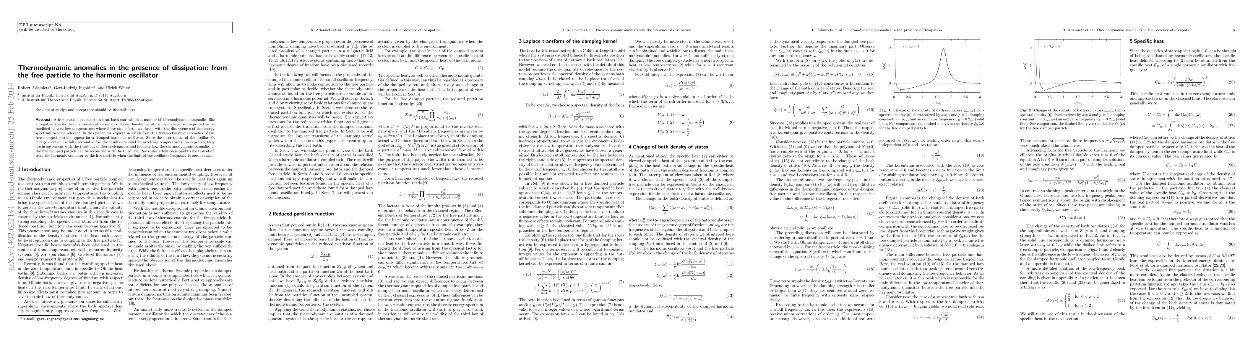 A free particle coupled to a heat bath can exhibit a number of thermodynamic anomalies like a negative specific heat or reentrant classicality. These low-temperature phenomena are expected to be modified at very low temperatures where finite-size effects associated with the discreteness of the energy spectrum become relevant. In this paper, we explore in which form the thermodynamic anomalies of the free damped particle appear for a damped harmonic oscillator. Since the discreteness of the oscillator's energy spectrum is fully accounted for, the results are valid for arbitrary temperatures. As expected, they are in agreement with the third law of thermodynamics and indicate how the thermodynamic anomalies of the free damped particle can be reconciled with the third law. Particular attention is paid to the transition from the harmonic oscillator to the free particle when the limit of the oscillator frequency to zero is taken.