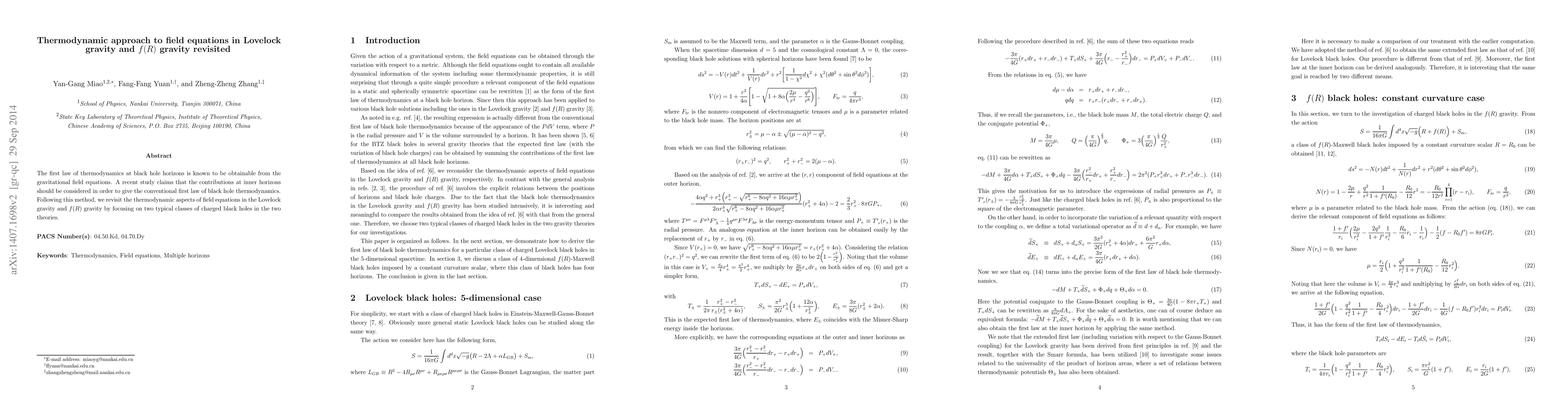 The first law of thermodynamics at black hole horizons is known to be obtainable from the gravitational field equations. A recent study claims that the contributions at inner horizons should be considered in order to give the conventional first law of black hole thermodynamics. Following this method, we revisit the thermodynamic aspects of field equations in the Lovelock gravity and f(R) gravity by focusing on two typical classes of charged black holes in the two theories.
