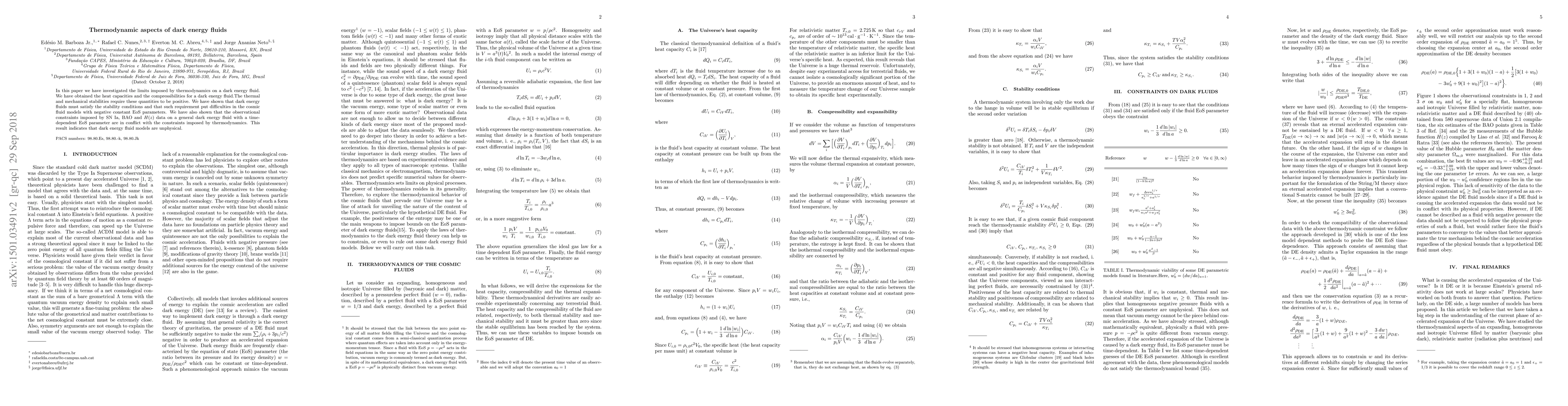 In this paper we have investigated the limits imposed by thermodynamics on a dark energy fluid. We have obtained the heat capacities and the compressibilities for a dark energy fluid. The thermal and mechanical stabilities require these quantities to be positive. We have shown that dark energy fluids must satisfy the stability conditions and that such requirement put difficulties in the cosmic fluid models with negative constant EoS parameters. We have also shown that the observational constraints imposed by SN Ia, BAO and $H(z)$ data on a general dark energy fluid with a time-dependent EoS parameter are in conflict with the constraints imposed by thermodynamics. This result indicates that dark energy fluid models are unphysical.