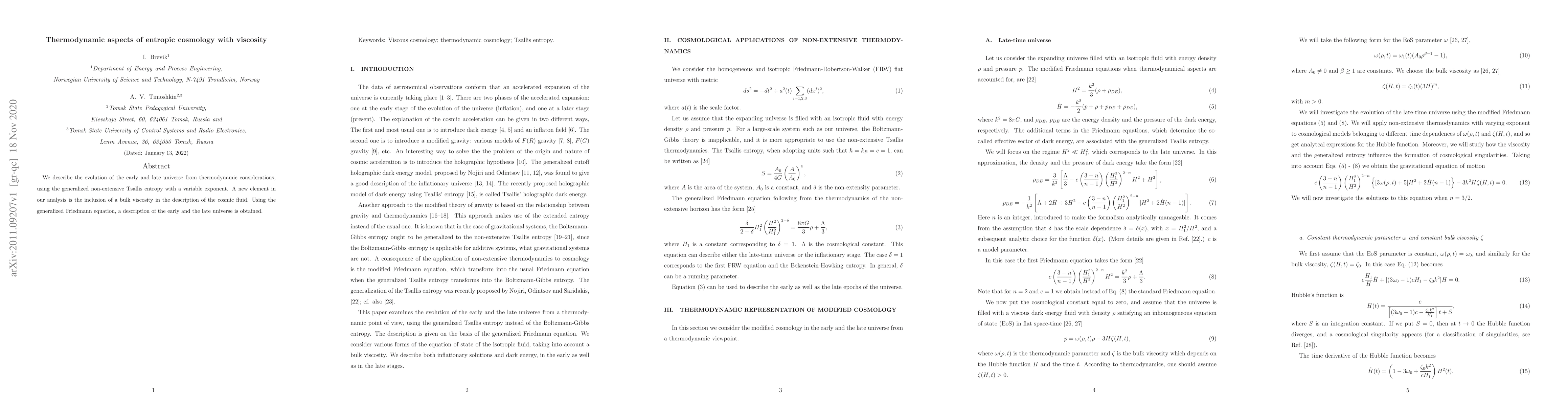 We describe the evolution of the early and late universe from thermodynamic considerations, using the generalized non-extensive Tsallis entropy with a variable exponent. A new element in our analysis is the inclusion of a bulk viscosity in the description of the cosmic fluid. Using the generalized Friedmann equation, a description of the early and the late universe is obtained.