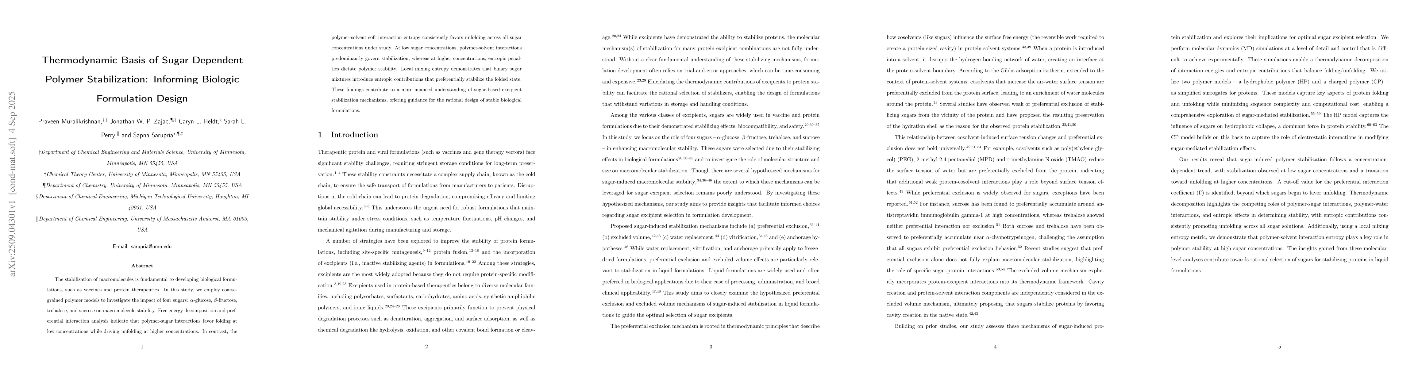 The stabilization of macromolecules is fundamental to developing biological formulations, such as vaccines and protein therapeutics. In this study, we employ coarse grained polymer models to investigate the impact of four sugars: {\alpha}-glucose, {\beta}-fructose, trehalose, and sucrose on macromolecule stability. Free energy decomposition and preferential interaction analysis indicate that polymer-sugar interactions favor folding at low concentrations while driving unfolding at higher concentrations. In contrast, the polymer-solvent soft interaction entropy consistently favors unfolding across all sugar concentrations under study. At low sugar concentrations, polymer-solvent interactions predominantly govern stabilization, whereas at higher concentrations, entropic penalties dictate polymer stability. Local mixing entropy demonstrates that binary sugar mixtures introduce entropic contributions that preferentially stabilize the folded state. These findings contribute to a more nuanced understanding of sugar-based excipient stabilization mechanisms, offering guidance for the rational design of stable biological formulations.