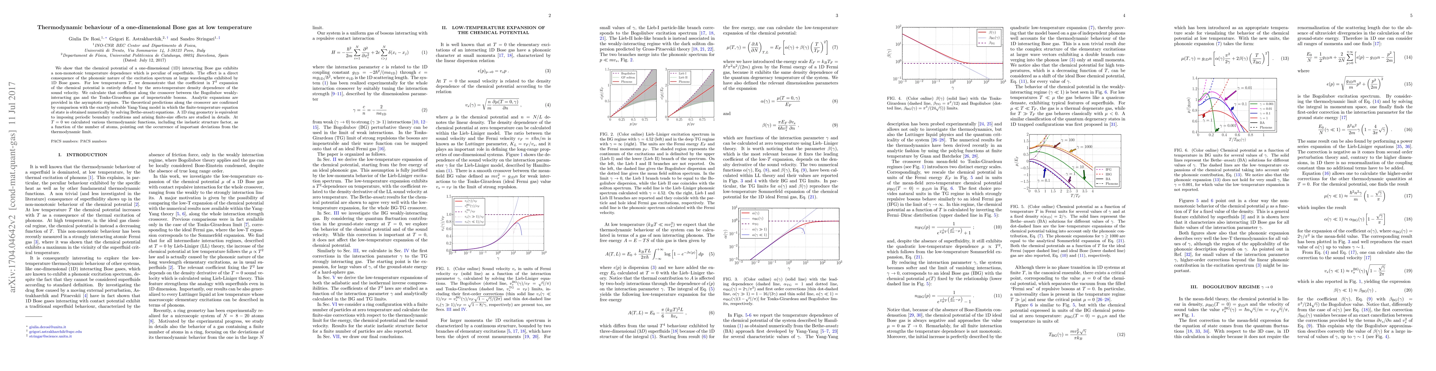 We show that the chemical potential of a one-dimensional (1D) interacting Bose gas exhibits a non-monotonic temperature dependence which is peculiar of superfluids. The effect is a direct consequence of the phononic nature of the excitation spectrum at large wavelengths exhibited by 1D Bose gases. For low temperatures $T$, we demonstrate that the coefficient in $T^2$ expansion of the chemical potential is entirely defined by the zero-temperature density dependence of the sound velocity. We calculate that coefficient along the crossover between the Bogoliubov weakly-interacting gas and the Tonks-Girardeau gas of impenetrable bosons. Analytic expansions are provided in the asymptotic regimes. The theoretical predictions along the crossover are confirmed by comparison with the exactly solvable Yang-Yang model in which the finite-temperature equation of state is obtained numerically by solving Bethe-{\it ansatz} equations. A 1D ring geometry is equivalent to imposing periodic boundary conditions and arising finite-size effects are studied in details. At $T=0$ we calculated various thermodynamic functions, including the inelastic structure factor, as a function of the number of atoms, pointing out the occurrence of important deviations from the thermodynamic limit.